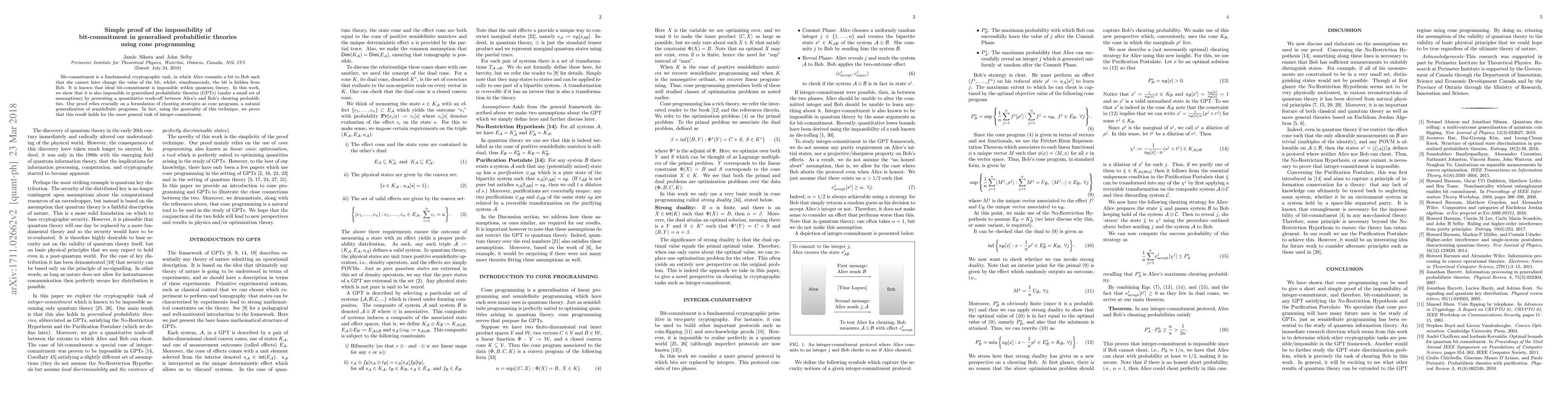 This paper demonstrates the impossibility of bit-commitment in generalised probabilistic theories, showing a quantitative trade-off between cheating probabilities for Alice and Bob. The proof leverages cone programming, a generalisation of semidefinite programs, to formulate cheating strategies.