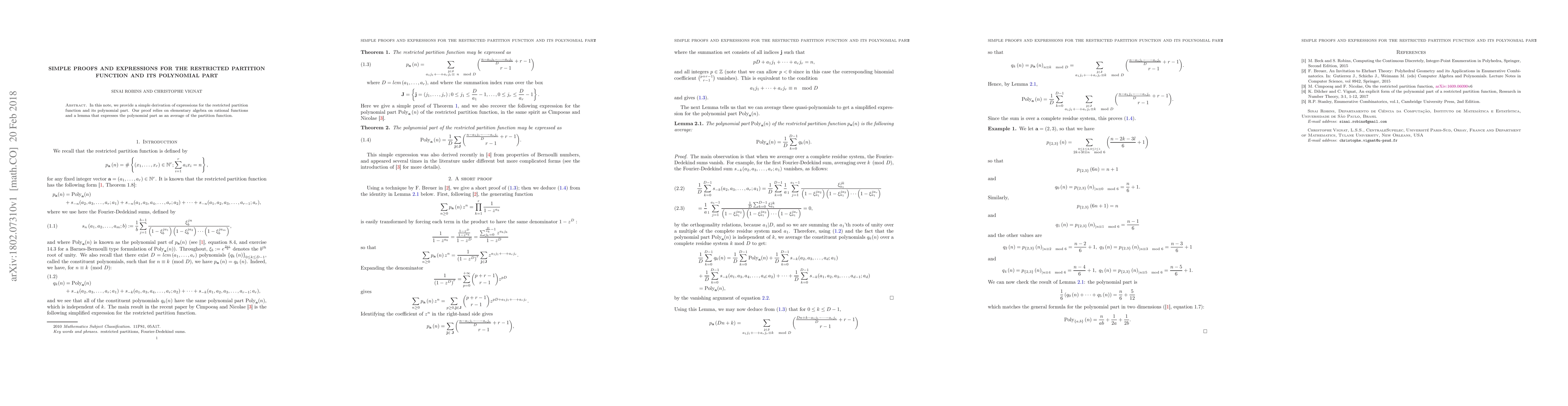 This paper offers straightforward algebraic proofs for the restricted partition function and its polynomial component, utilizing rational functions and a lemma to connect the two via averaging.