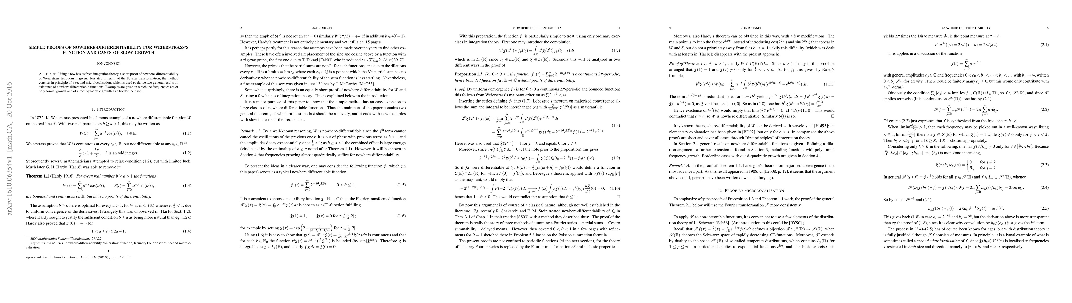 Using a few basics from integration theory, a short proof of nowhere-differentiability of Weierstrass functions is given. Restated in terms of the Fourier transformation, the method consists in principle of a second microlocalisation, which is used to derive two general results on existence of nowhere differentiable functions. Examples are given in which the frequencies are of polynomial growth and of almost quadratic growth as a borderline case.