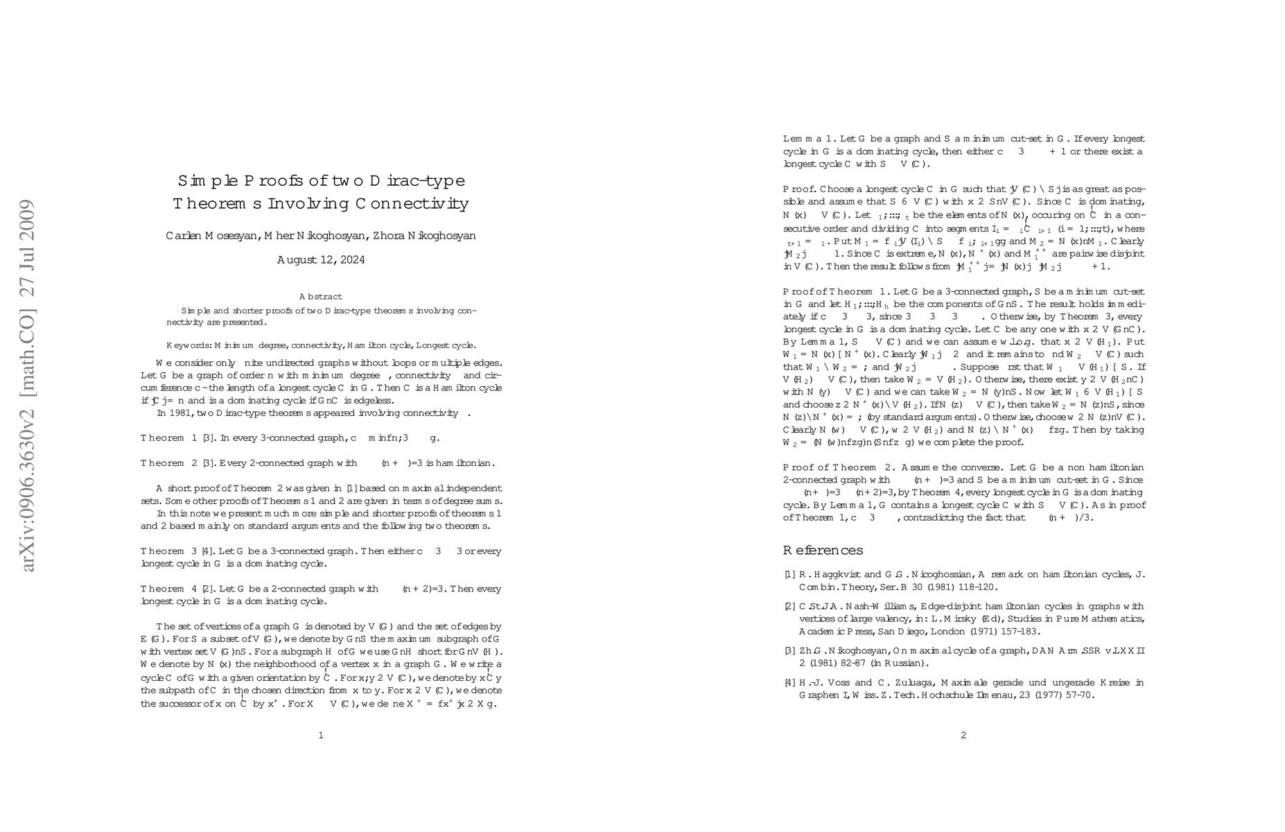 Simple and shorter proofs of two Dirac-type theorems involving connectivity are presented.