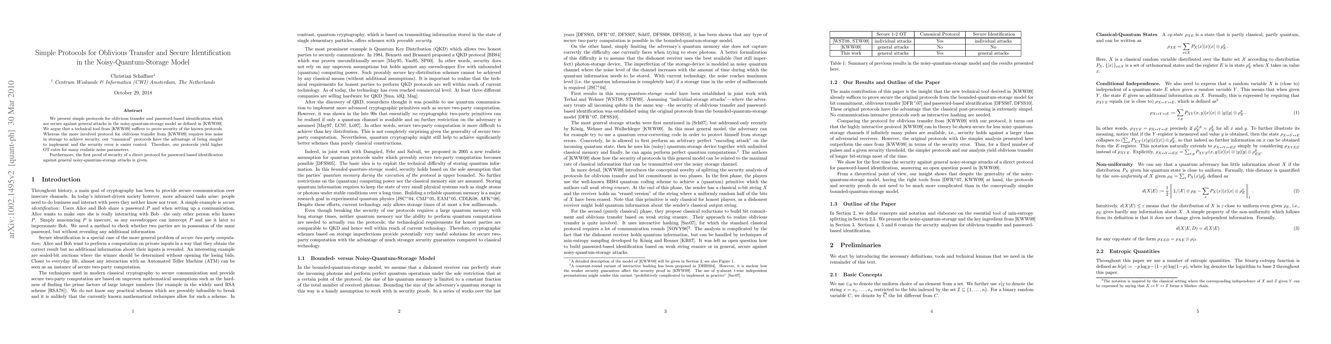 This paper introduces simple protocols for oblivious transfer and password-based identification that are secure against general attacks in the noisy-quantum-storage model. The proposed "canonical" protocols are easier to implement and control compared to existing methods, resulting in higher OT-rates for practical noise levels.