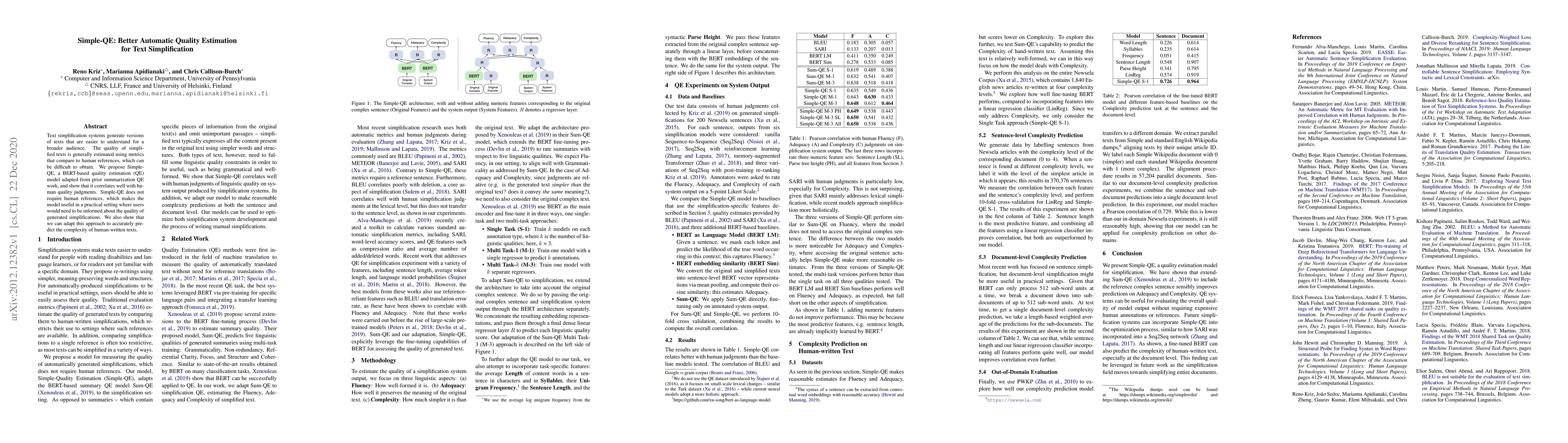 Simple-QE is a BERT-based model for automatic quality estimation of text simplifications, correlating well with human judgments without requiring human references. It also extends to predicting the complexity of human-written texts.