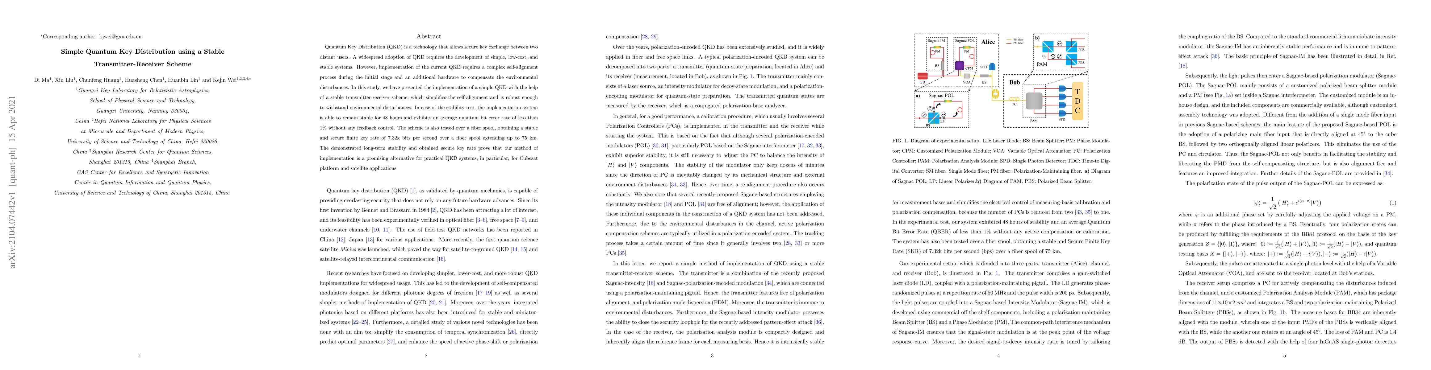 Quantum Key Distribution (QKD) is a technology that allows secure key exchange between two distant users. A widespread adoption of QKD requires the development of simple, low-cost, and stable systems. However, implementation of the current QKD requires a complex self-alignment process during the initial stage and an additional hardware to compensate the environmental disturbances. In this study, we have presented the implementation of a simple QKD with the help of a stable transmitter-receiver scheme, which simplifies the self-alignment and is robust enough to withstand environmental disturbances. In case of the stability test, the implementation system is able to remain stable for 48 hours and exhibits an average quantum bit error rate of less than 1\% without any feedback control. The scheme is also tested over a fiber spool, obtaining a stable and secure finite key rate of 7.32k bits per second over a fiber spool extending up to 75 km. The demonstrated long-term stability and obtained secure key rate prove that our method of implementation is a promising alternative for practical QKD systems, in particular, for Cubesat platform and satellite applications.