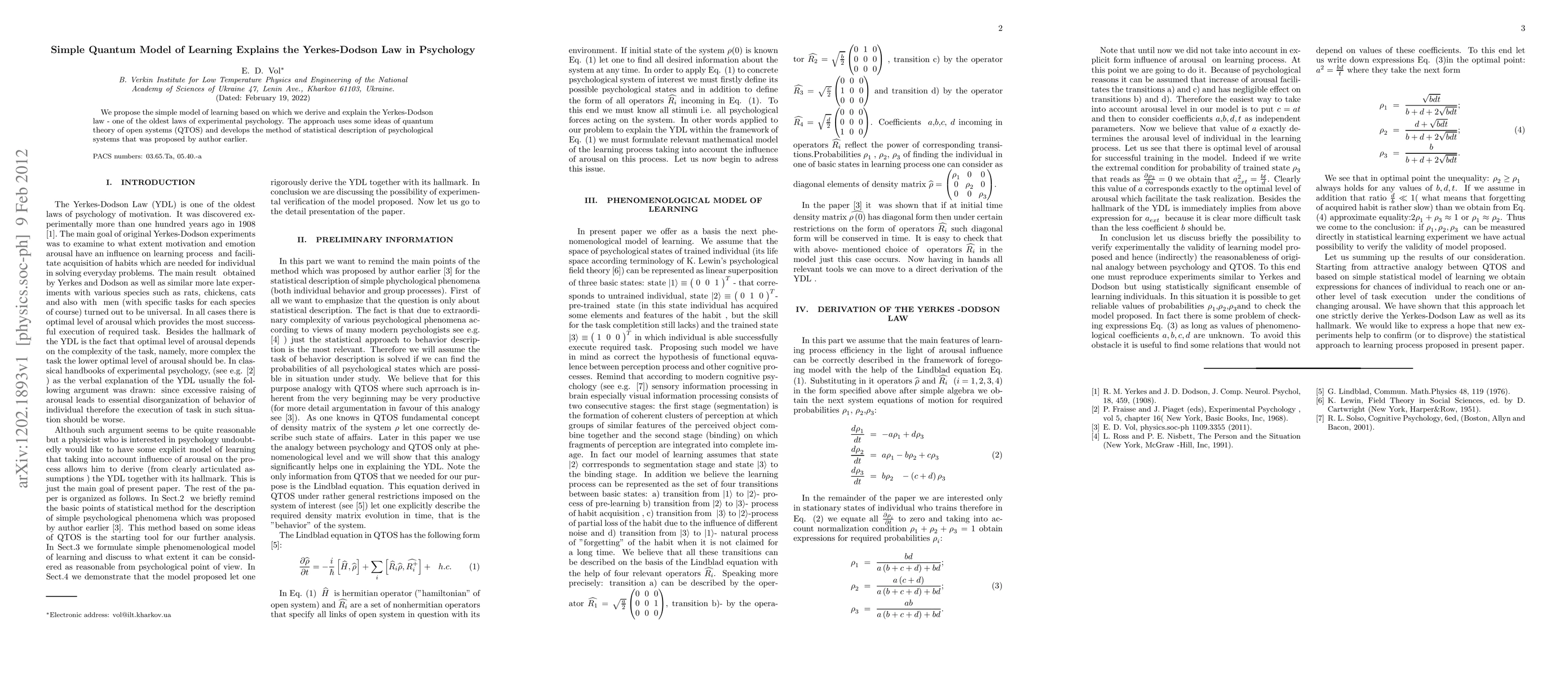We propose the simple model of learning based on which we derive and explain the Yerkes-Dodson law - one of the oldest laws of experimental psychology. The approach uses some ideas of quantum theory of open systems (QTOS) and develops the method of statistical description of psychological systems that was proposed by author earlier.