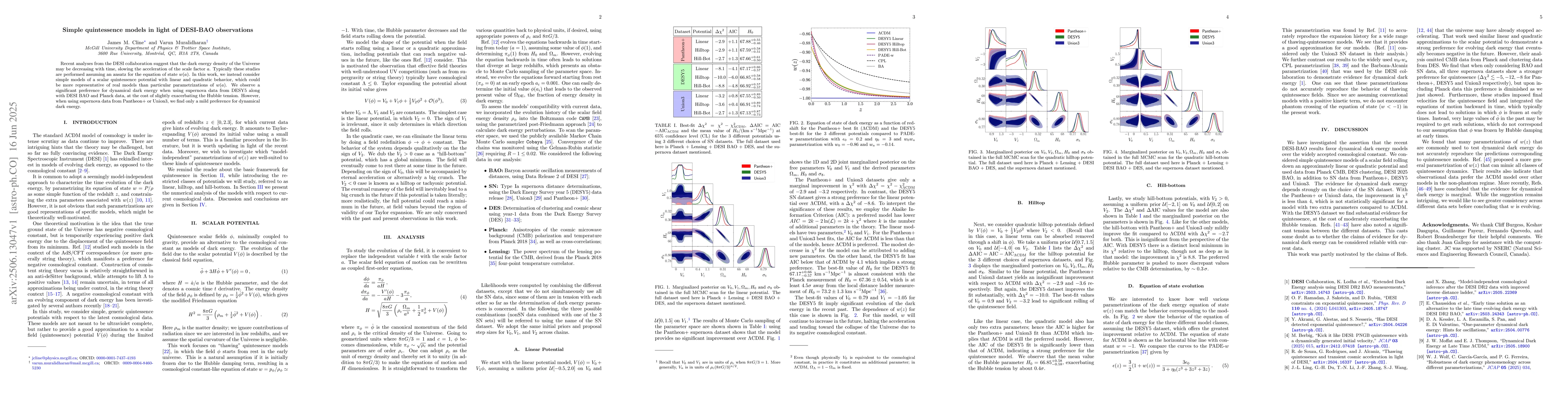Recent analyses from the DESI collaboration suggest that the dark energy density of the Universe may be decreasing with time, slowing the acceleration of the scale factor $a$. Typically these studies are performed assuming an ansatz for the equation of state $w(a)$. In this work, we instead consider simple models of a scalar quintessence potential with linear and quadratic behavior, which could be more representative of real models than particular parametrizations of $w(a)$. We observe a significant preference for dynamical dark energy when using supernova data from DESY5 along with DESI BAO and Planck data, at the cost of slightly exacerbating the Hubble tension. However, when using supernova data from Pantheon+ or Union3, we find only a mild preference for dynamical dark energy.