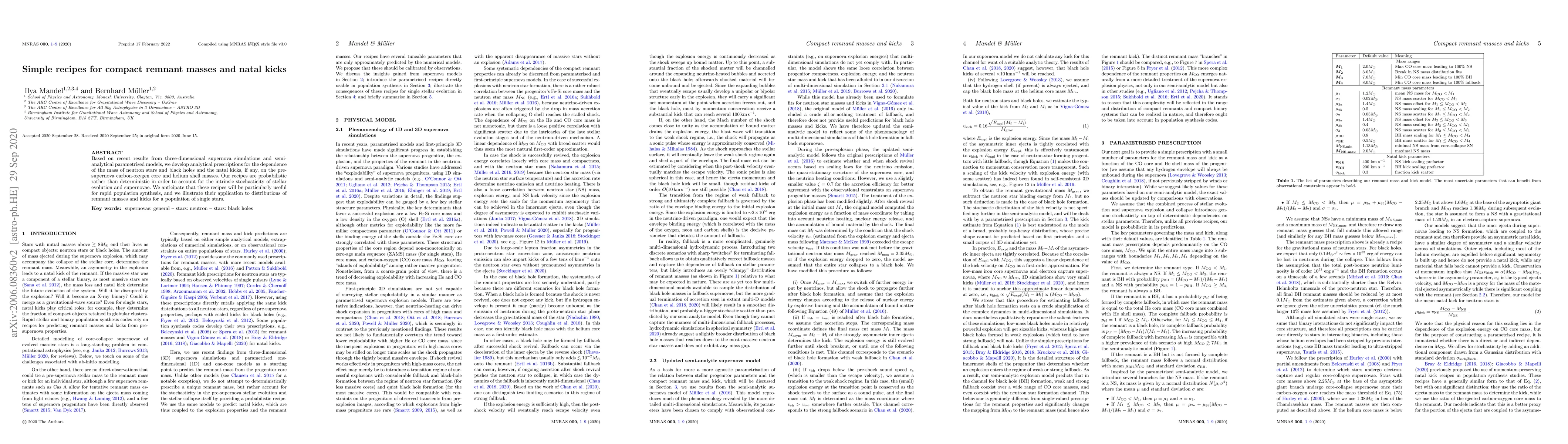 Based on recent results from three-dimensional supernova simulations and semi-analytical parametrised models, we develop analytical prescriptions for the dependence of the mass of neutron stars and black holes and the natal kicks, if any, on the pre-supernova carbon-oxygen core and helium shell masses. Our recipes are probabilistic rather than deterministic in order to account for the intrinsic stochasticity of stellar evolution and supernovae. We anticipate that these recipes will be particularly useful for rapid population synthesis, and we illustrate their application to distributions of remnant masses and kicks for a population of single stars.