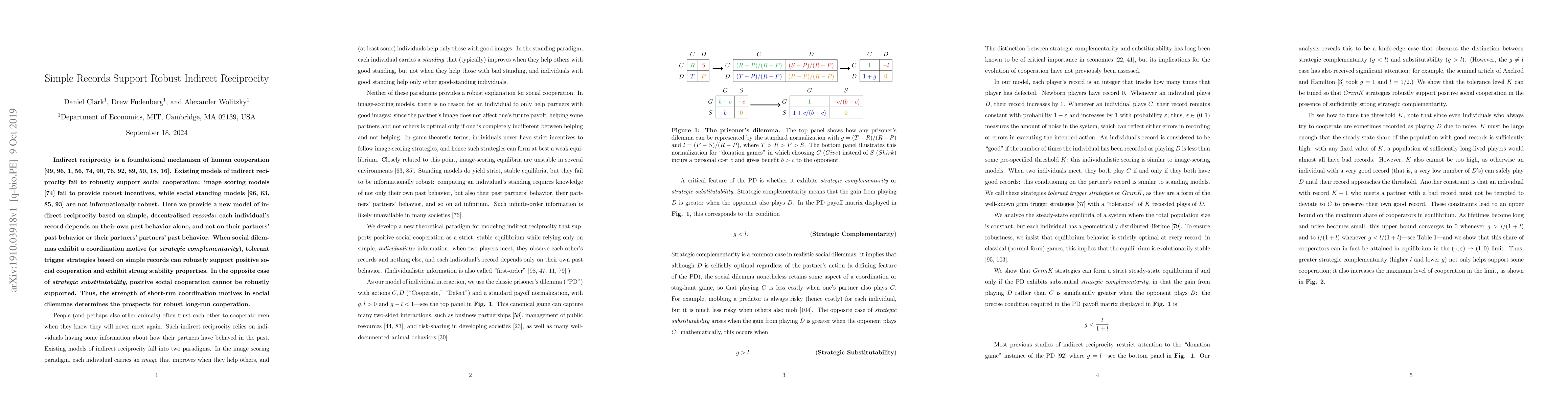 This paper introduces a new model of indirect reciprocity based on simple, decentralized records that robustly support social cooperation when coordination motives are present. The model shows that tolerant trigger strategies relying on individual past behavior can maintain positive cooperation, but fails to support it in scenarios of strategic substitutability.