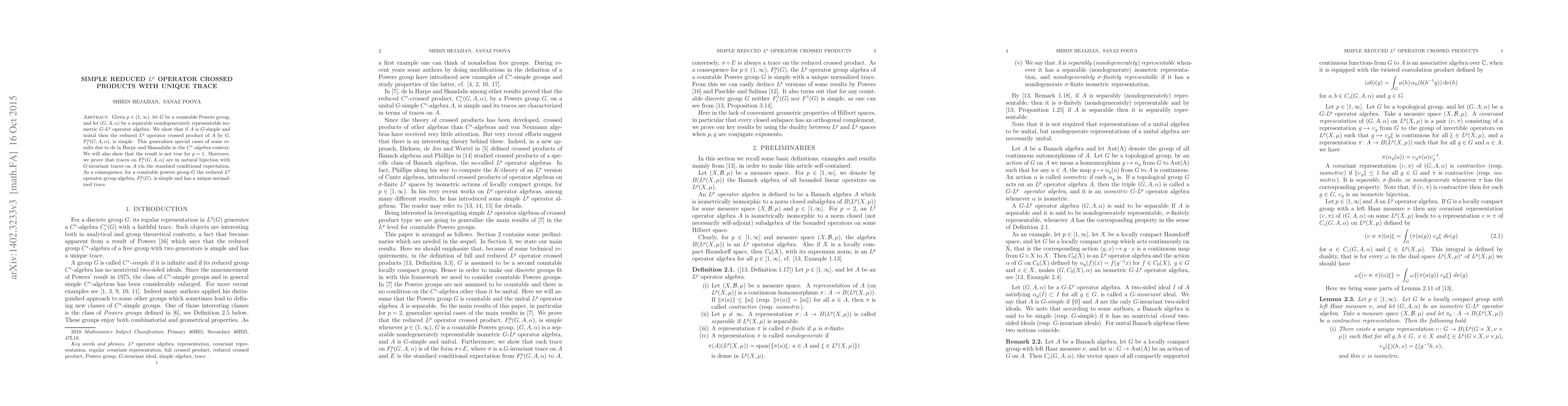 In this article we study simplicity and traces of reduced $L^p$ operator crossed products $F^p_{\mathrm{r}}(G, A, \alpha)$. Given $p \in (1, \infty)$, let $G$ be a Powers group, and let $\alpha \colon G \to Aut(A)$ be an isometric action of $G$ on a unital $L^p$ operator algebra $A$ such that $A$ is $G$-simple. We prove that the reduced $L^p$ operator crossed product of $A$ by $G$, $F^p_{\mathrm{r}}(G, A, \alpha)$, is simple. Moreover, we show that traces on $F^p_{\mathrm{r}}(G, A, \alpha)$ are in correspondence with $G$-invariant traces on A. Our results generalize the results obtained by de la Harpe for reduced $C^*$crossed products in 1985. By letting $G$ be a countable nonabelian free group as a special case, we recover an analogue of a result of Powers from 1975. For the case $p = 1$, it turns out that (reduced) $L^p$ operator group algebras are not simple.