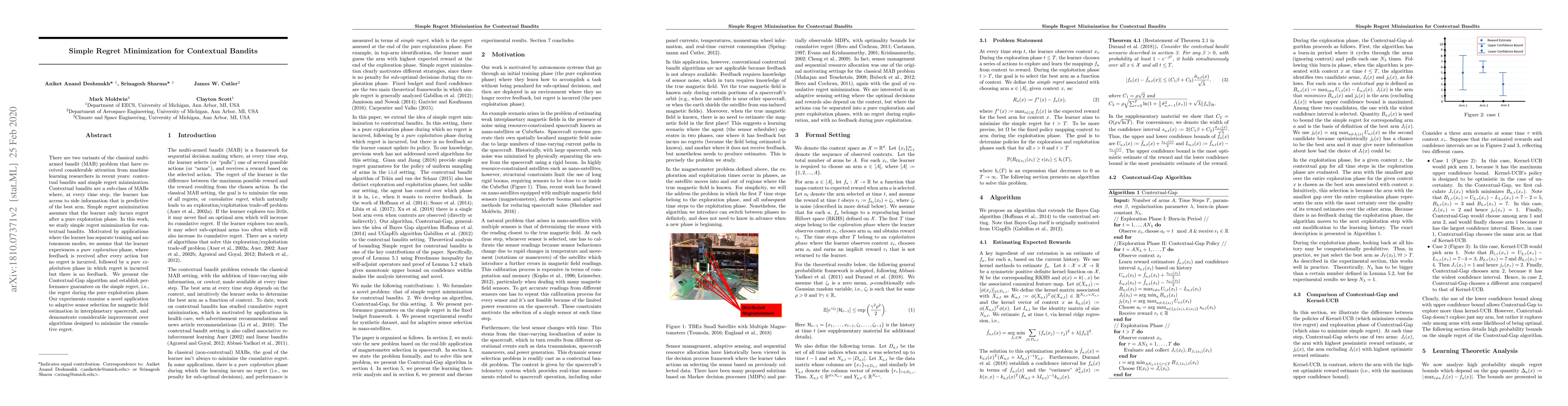 This paper proposes the Contextual-Gap algorithm for simple regret minimization in contextual bandits, focusing on scenarios with distinct exploration and exploitation phases. The algorithm demonstrates significant improvement over cumulative regret minimization methods in adaptive sensor selection for magnetic field estimation in spacecraft.