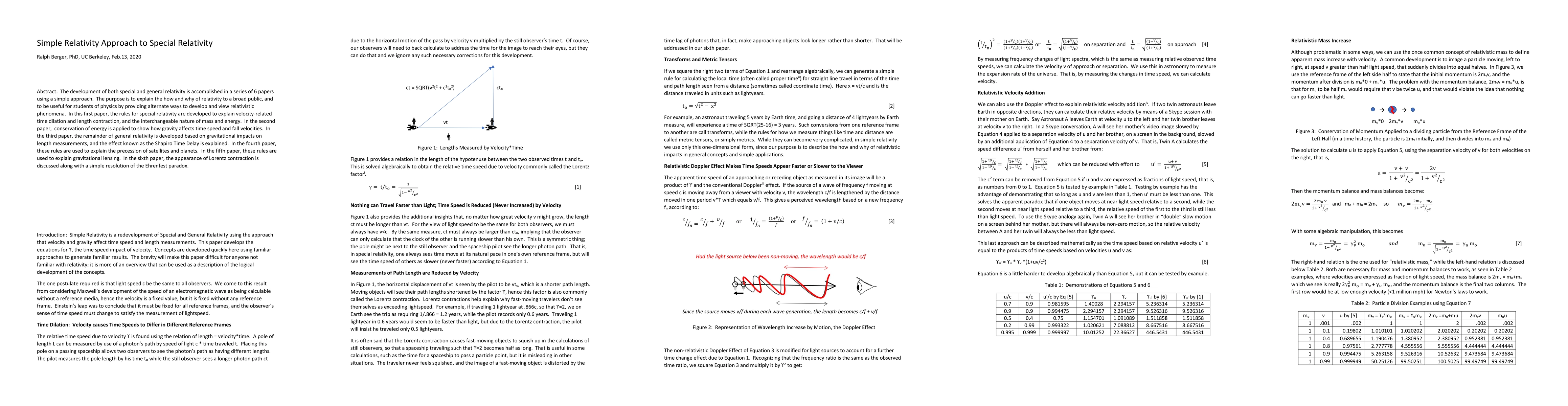 The paper presents a simple relativity approach to special relativity using conventional models, avoiding non-Newtonian concepts like Minkowski diagrams or time-as-a-dimension. It aims to simplify complex general relativity relations in subsequent papers.