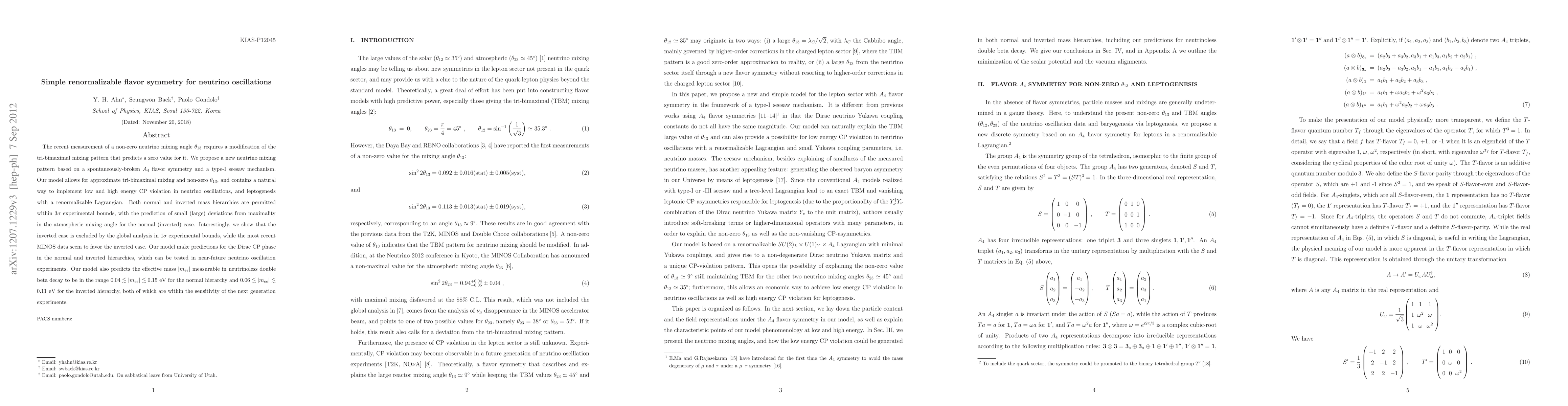 The recent measurement of a non-zero neutrino mixing angle $\theta_{13}$ requires a modification of the tri-bimaximal mixing pattern that predicts a zero value for it. We propose a new neutrino mixing pattern based on a spontaneously-broken $A_{4}$ flavor symmetry and a type-I seesaw mechanism. Our model allows for approximate tri-bimaximal mixing and non-zero $\theta_{13}$, and contains a natural way to implement low and high energy CP violation in neutrino oscillations, and leptogenesis with a renormalizable Lagrangian. Both normal and inverted mass hierarchies are permitted within $3\sigma$ experimental bounds, with the prediction of small (large) deviations from maximality in the atmospheric mixing angle for the normal (inverted) case. Interestingly, we show that the inverted case is excluded by the global analysis in $1\sigma$ experimental bounds, while the most recent MINOS data seem to favor the inverted case. Our model make predictions for the Dirac CP phase in the normal and inverted hierarchies, which can be tested in near-future neutrino oscillation experiments. Our model also predicts the effective mass $|m_{ee}|$ measurable in neutrinoless double beta decay to be in the range $0.04\lesssim |m_{ee}| \lesssim 0.15$ eV for the normal hierarchy and $0.06\lesssim |m_{ee}| \lesssim 0.11$ eV for the inverted hierarchy, both of which are within the sensitivity of the next generation experiments.