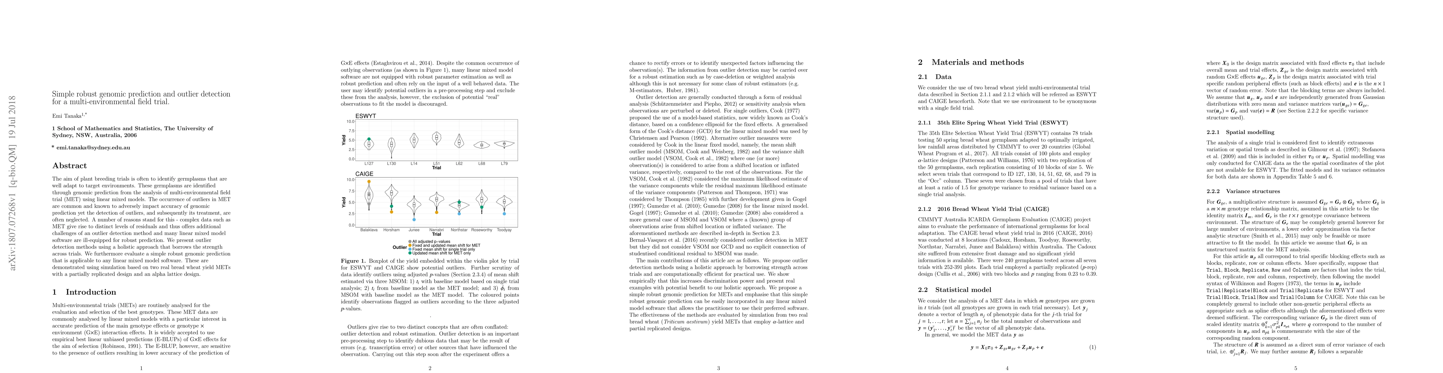 This paper presents methods for detecting outliers in multi-environment field trials and a simple robust genomic prediction approach that can be applied to any linear mixed model software, improving the accuracy of plant breeding trials.