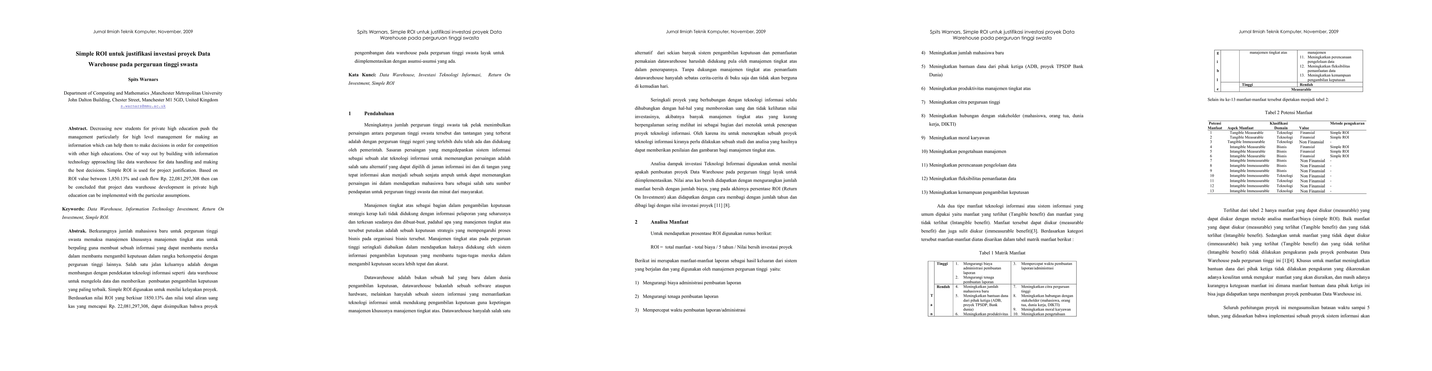 Decreasing new students for private high education push the management particularly for high level management for making an information which can help them to make decisions in order for competition with other high educations. One of way out by building with information technology approaching like data warehouse for data handling and making the best decisions. Simple ROI is used for project justification. Based on ROI value between 1,850.13% and cash flow Rp. 22,081,297,308 then can be concluded that project data warehouse development in private high education can be implemented with the particular assumptions.