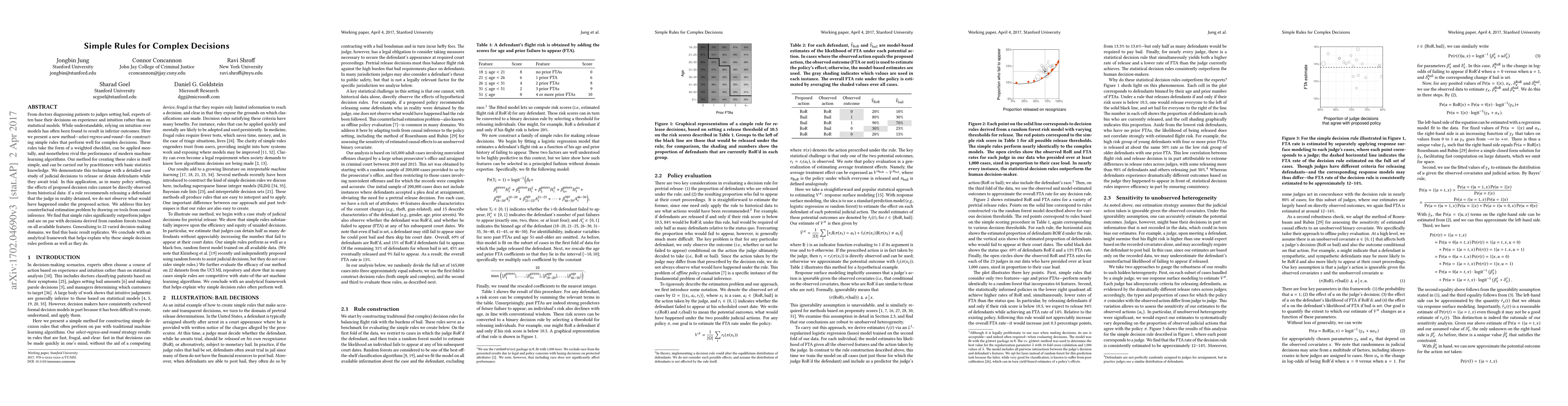 From doctors diagnosing patients to judges setting bail, experts often base their decisions on experience and intuition rather than on statistical models. While understandable, relying on intuition over models has often been found to result in inferior outcomes. Here we present a new method, select-regress-and-round, for constructing simple rules that perform well for complex decisions. These rules take the form of a weighted checklist, can be applied mentally, and nonetheless rival the performance of modern machine learning algorithms. Our method for creating these rules is itself simple, and can be carried out by practitioners with basic statistics knowledge. We demonstrate this technique with a detailed case study of judicial decisions to release or detain defendants while they await trial. In this application, as in many policy settings, the effects of proposed decision rules cannot be directly observed from historical data: if a rule recommends releasing a defendant that the judge in reality detained, we do not observe what would have happened under the proposed action. We address this key counterfactual estimation problem by drawing on tools from causal inference. We find that simple rules significantly outperform judges and are on par with decisions derived from random forests trained on all available features. Generalizing to 22 varied decision-making domains, we find this basic result replicates. We conclude with an analytical framework that helps explain why these simple decision rules perform as well as they do.