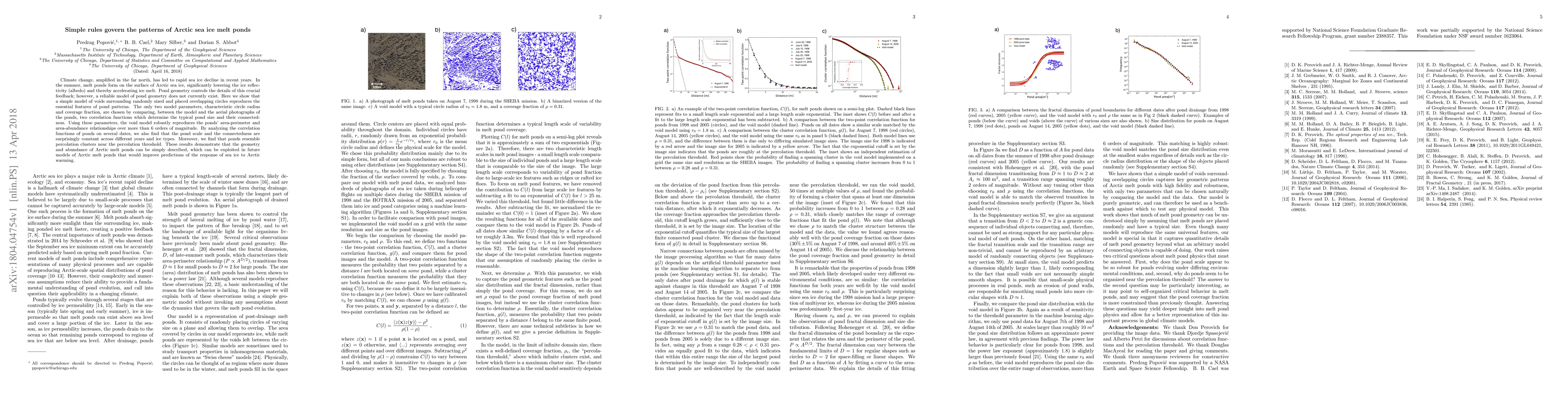 This paper demonstrates that simple void models with randomly sized and placed overlapping circles can accurately replicate the patterns of Arctic sea ice melt ponds. The model's parameters, determined by comparing correlation functions with aerial photographs, robustly reproduce the ponds' area-perimeter and area-abundance relationships, indicating consistent pond scale and connectedness across different years and ice types.