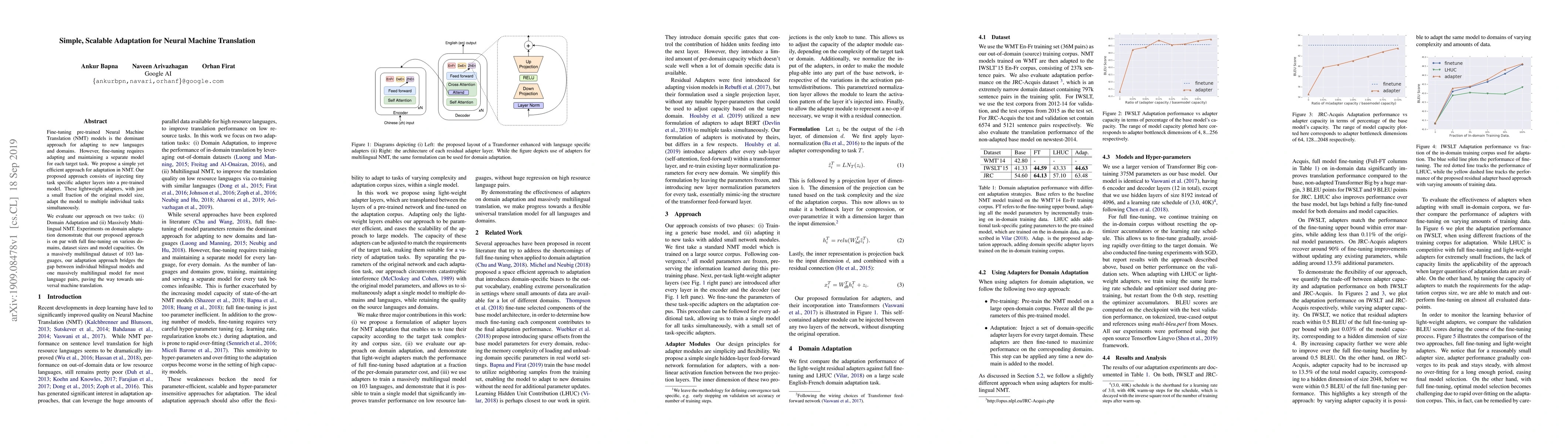 This paper proposes a lightweight adaptation method for Neural Machine Translation (NMT) by adding tiny task-specific adapter layers to a pre-trained model, enabling efficient adaptation to multiple tasks without full fine-tuning. Experiments show that this approach performs comparably to full fine-tuning for domain adaptation and significantly reduces the gap for multilingual NMT.