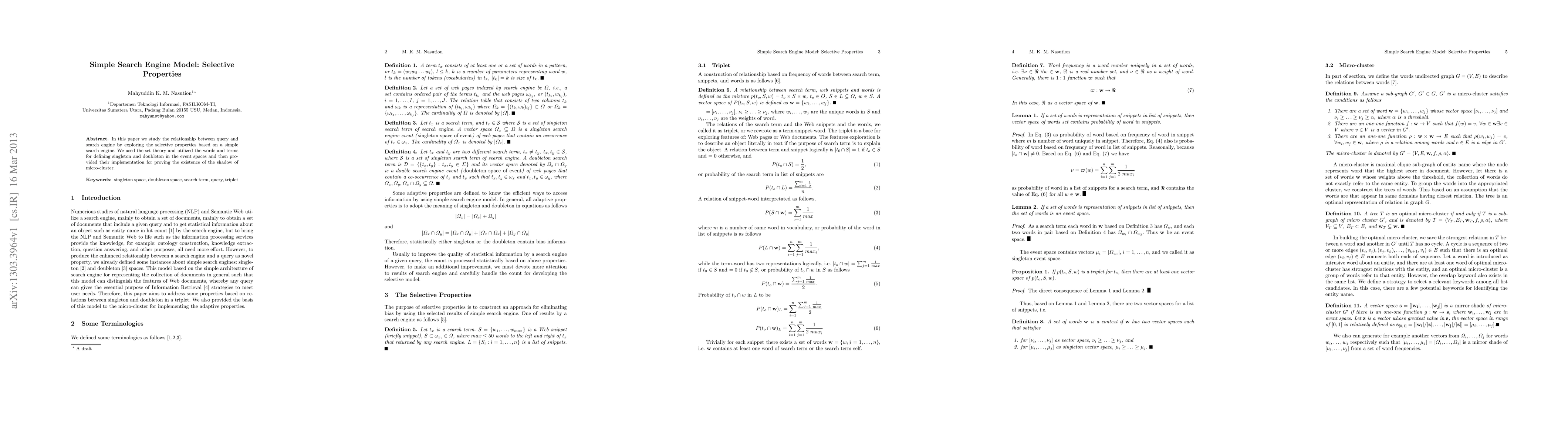 In this paper we study the relationship between query and search engine by exploring the selective properties based on a simple search engine. We used the set theory and utilized the words and terms for defining singleton and doubleton in the event spaces and then provided their implementation for proving the existence of the shadow of micro-cluster.