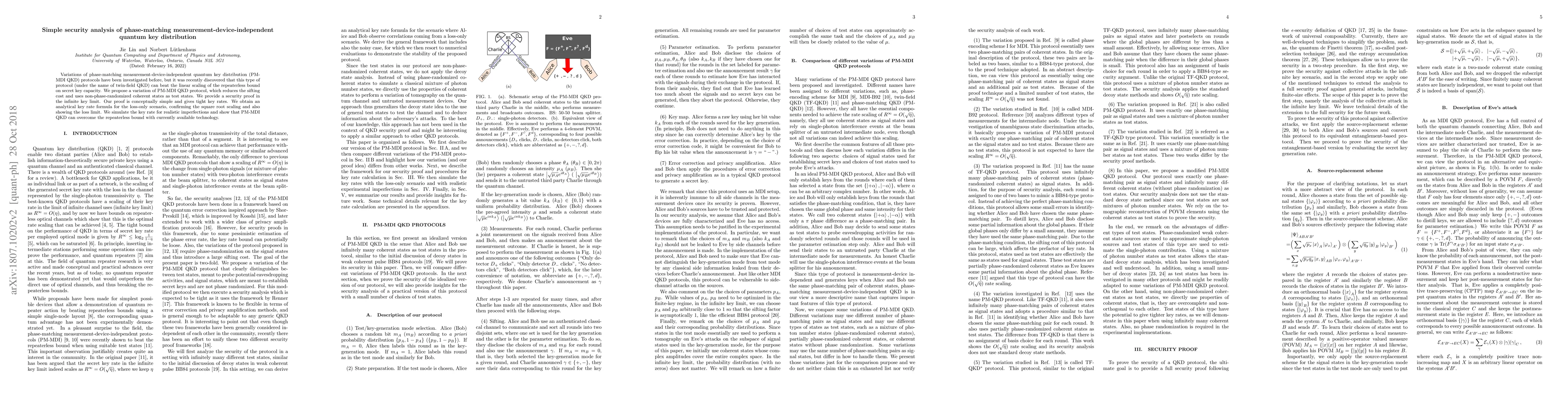 This paper proposes a variation of phase-matching measurement-device-independent quantum key distribution (PM-MDI QKD) that reduces sifting costs and uses non-phase-randomized coherent states. The authors provide a simple security proof and demonstrate that PM-MDI QKD can exceed the repeaterless bound on secret key rate capacity with current technology.
