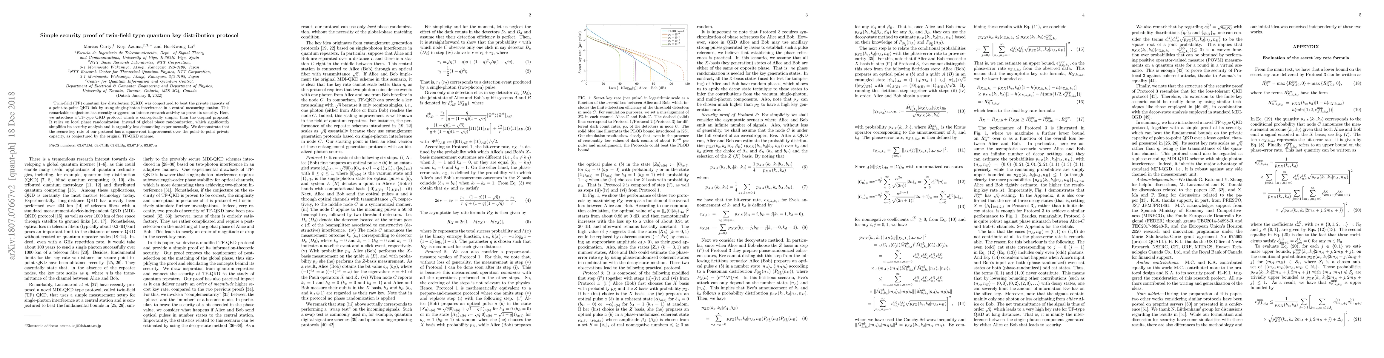 Twin-field (TF) quantum key distribution (QKD) was conjectured to beat the private capacity of a point-to-point QKD link by using single-photon interference in a central measuring station. This remarkable conjecture has recently triggered an intense research activity to prove its security. Here, we introduce a TF-type QKD protocol which is conceptually simpler than the original proposal. It relies on local phase randomization, instead of global phase randomization, which significantly simplifies its security analysis and is arguably less demanding experimentally. We demonstrate that the secure key rate of our protocol has a square-root improvement over the point-to-point private capacity, as conjectured by the original TF-QKD scheme.