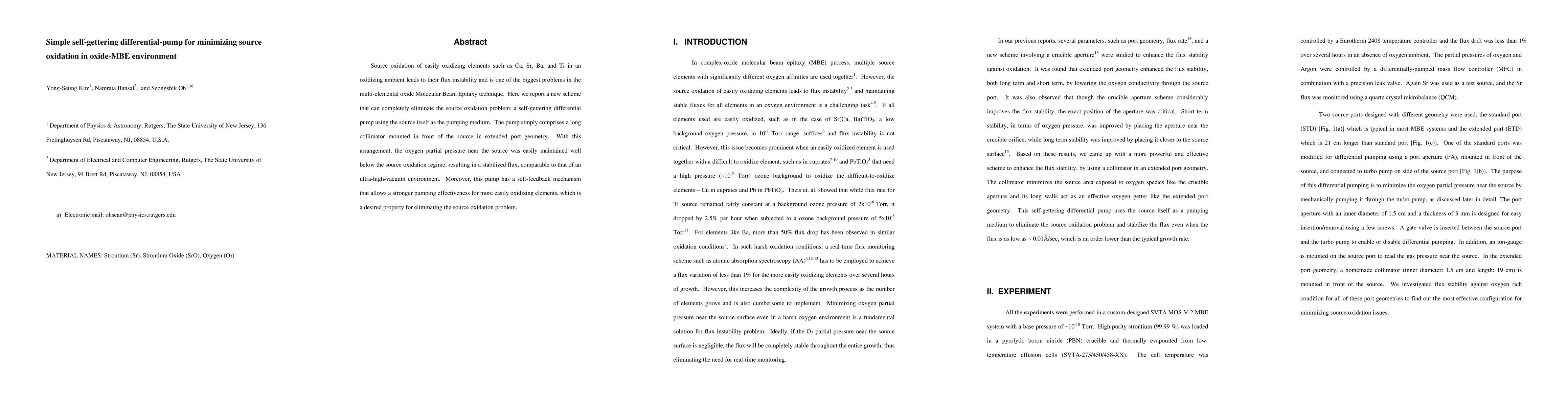 Source oxidation of easily oxidizing elements such as Ca, Sr, Ba, and Ti in an oxidizing ambient leads to their flux instability and is one of the biggest problems in the multi-elemental oxide Molecular Beam Epitaxy technique. Here we report a new scheme that can completely eliminate the source oxidation problem: a self-gettering differential pump using the source itself as the pumping medium. The pump simply comprises a long collimator mounted in front of the source in extended port geometry. With this arrangement, the oxygen partial pressure near the source was easily maintained well below the source oxidation regime, resulting in a stabilized flux, comparable to that of an ultra-high-vacuum environment. Moreover, this pump has a self-feedback mechanism that allows a stronger pumping effectiveness for more easily oxidizing elements, which is a desired property for eliminating the source oxidation problem.