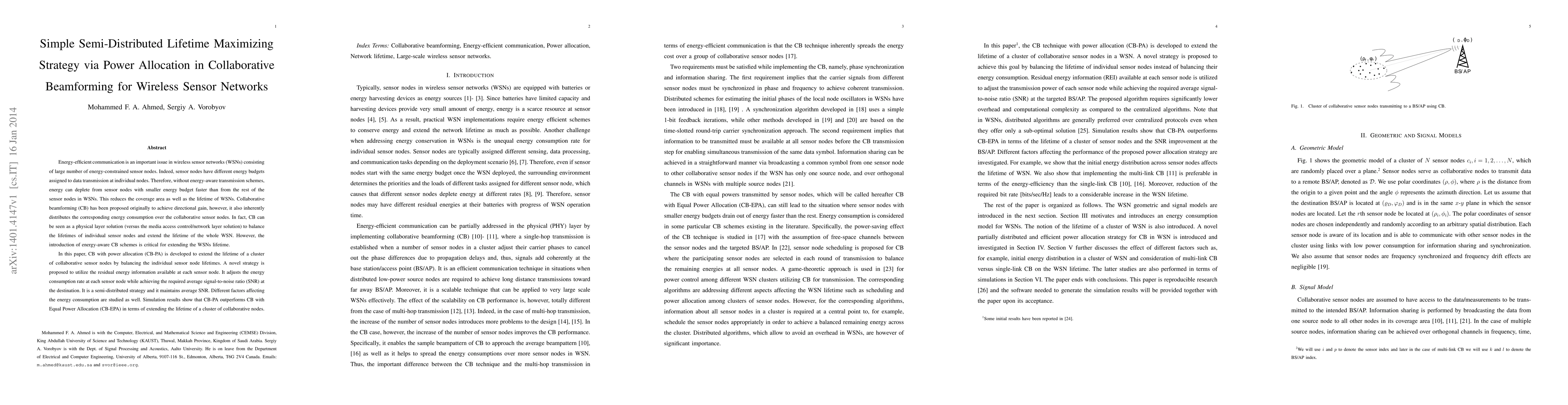 This paper proposes a semi-distributed collaborative beamforming strategy with power allocation (CB-PA) to maximize the lifetime of wireless sensor networks (WSNs) by balancing individual sensor node energy consumption. The strategy adjusts power allocation based on residual energy to maintain average signal-to-noise ratio (SNR) and outperforms equal power allocation methods in extending network lifetime.