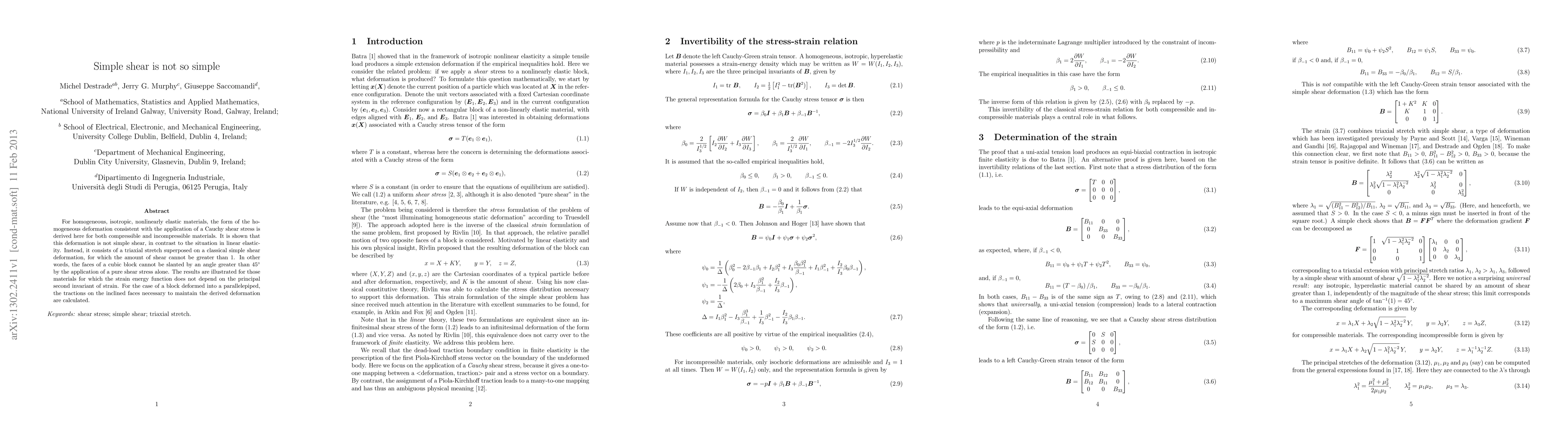 This paper derives the deformation for nonlinearly elastic materials under Cauchy shear stress, revealing it is not simple shear but a combination of triaxial stretch and classical simple shear, with a maximum shear angle of 45 degrees. The study also calculates necessary tractions for maintaining this deformation in materials where strain energy is independent of the second invariant of strain.