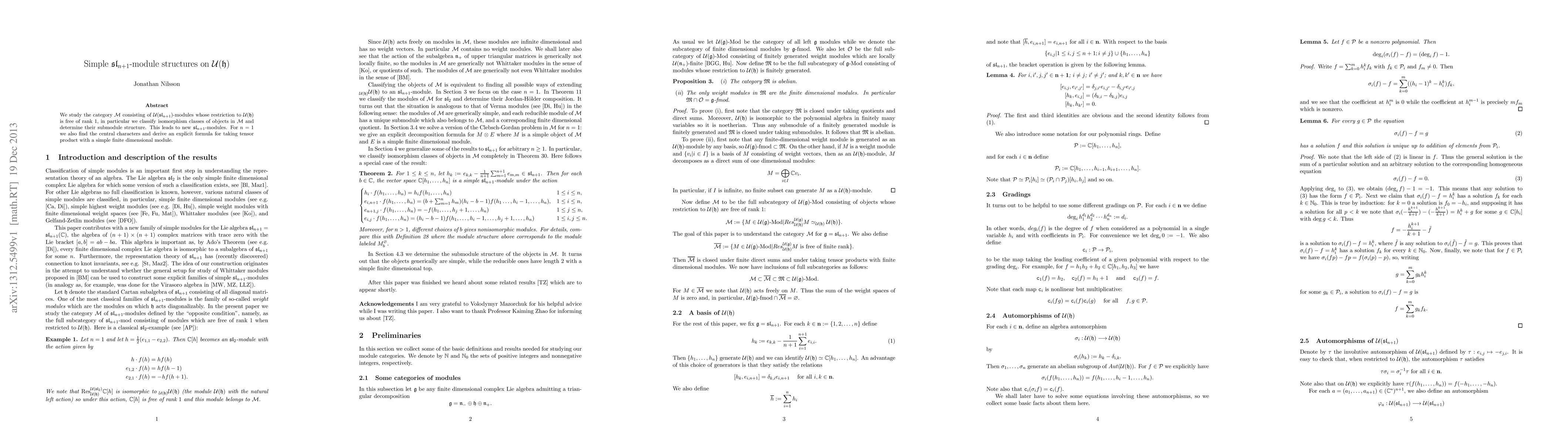 This paper classifies simple U(sl_{n+1})-modules whose restriction to U(h) is free of rank 1, determining their submodule structures and leading to new sl_{n+1}-modules. For n=1, it finds central characters and provides an explicit formula for tensor products with simple finite-dimensional modules.