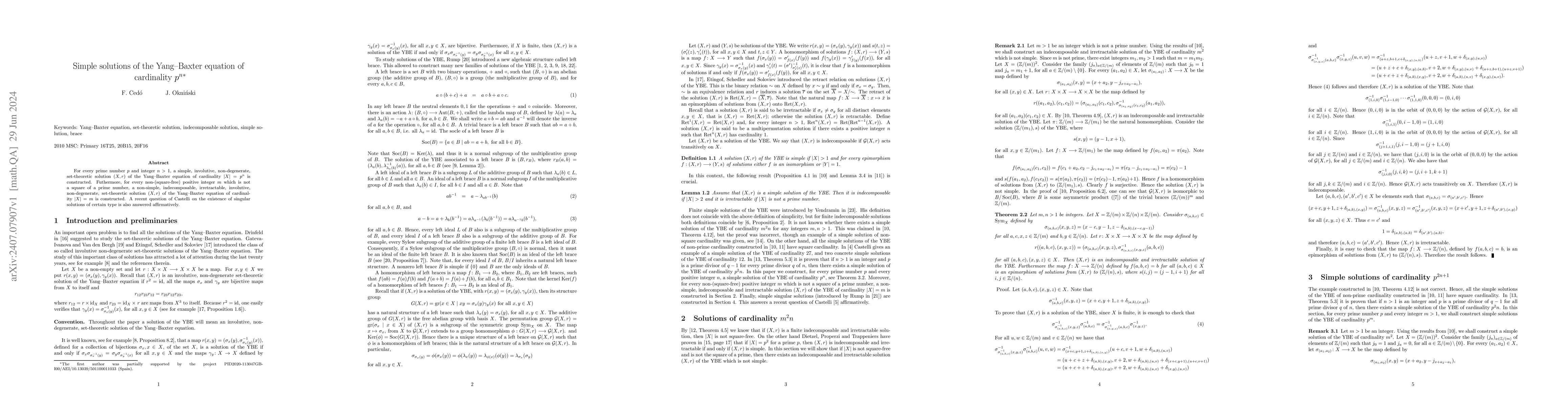 For every prime number p and integer $n>1$, a simple, involutive, non-degenerate set-theoretic solution $(X,r$) of the Yang-Baxter equation of cardinality $|X| = p^n$ is constructed. Furthermore, for every non-(square-free) positive integer m which is not the square of a prime number, a non-simple, indecomposable, irretractable, involutive, non-degenerate set-theoretic solution $(X,r)$ of the Yang-Baxter equation of cardinality $|X| = m$ is constructed. A recent question of Castelli on the existence of singular solutions of certain type is also answered affirmatively.