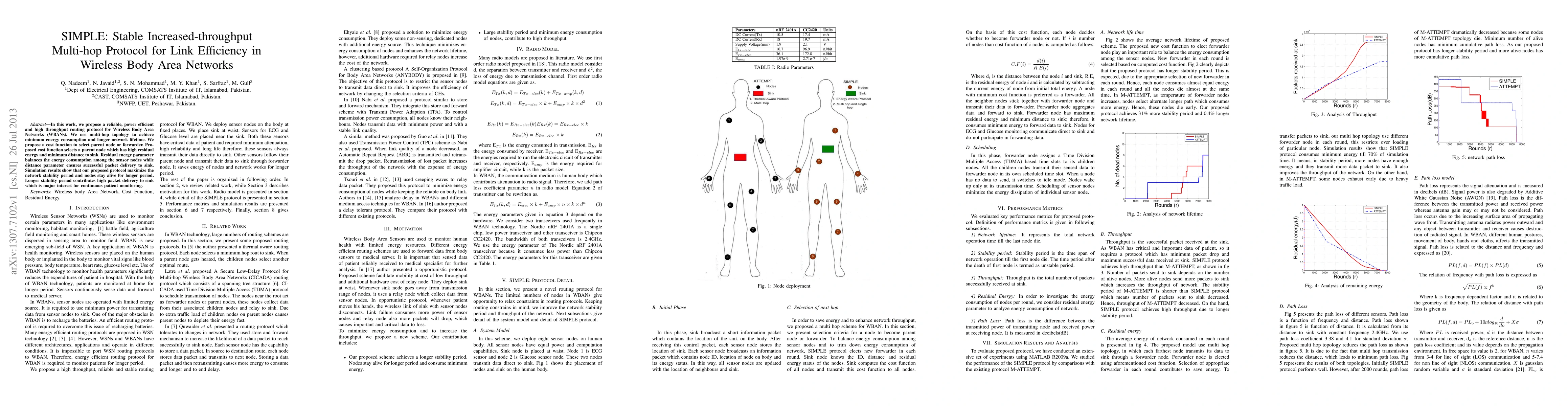 The paper proposes SIMPLE, a multi-hop routing protocol for Wireless Body Area Networks (WBANs) that aims for high throughput, power efficiency, and reliability. It selects parent nodes based on residual energy and distance to the sink, balancing energy consumption and ensuring packet delivery, resulting in extended network stability and longer node lifetime.