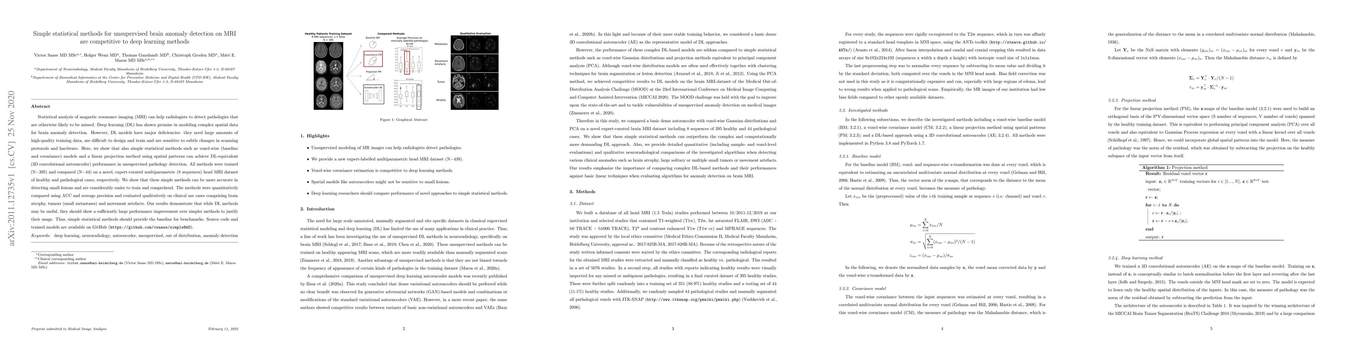Statistical analysis of magnetic resonance imaging (MRI) can help radiologists to detect pathologies that are otherwise likely to be missed. Deep learning (DL) has shown promise in modeling complex spatial data for brain anomaly detection. However, DL models have major deficiencies: they need large amounts of high-quality training data, are difficult to design and train and are sensitive to subtle changes in scanning protocols and hardware. Here, we show that also simple statistical methods such as voxel-wise (baseline and covariance) models and a linear projection method using spatial patterns can achieve DL-equivalent (3D convolutional autoencoder) performance in unsupervised pathology detection. All methods were trained (N=395) and compared (N=44) on a novel, expert-curated multiparametric (8 sequences) head MRI dataset of healthy and pathological cases, respectively. We show that these simple methods can be more accurate in detecting small lesions and are considerably easier to train and comprehend. The methods were quantitatively compared using AUC and average precision and evaluated qualitatively on clinical use cases comprising brain atrophy, tumors (small metastases) and movement artefacts. Our results demonstrate that while DL methods may be useful, they should show a sufficiently large performance improvement over simpler methods to justify their usage. Thus, simple statistical methods should provide the baseline for benchmarks. Source code and trained models are available on GitHub (https://github.com/vsaase/simpleBAD).