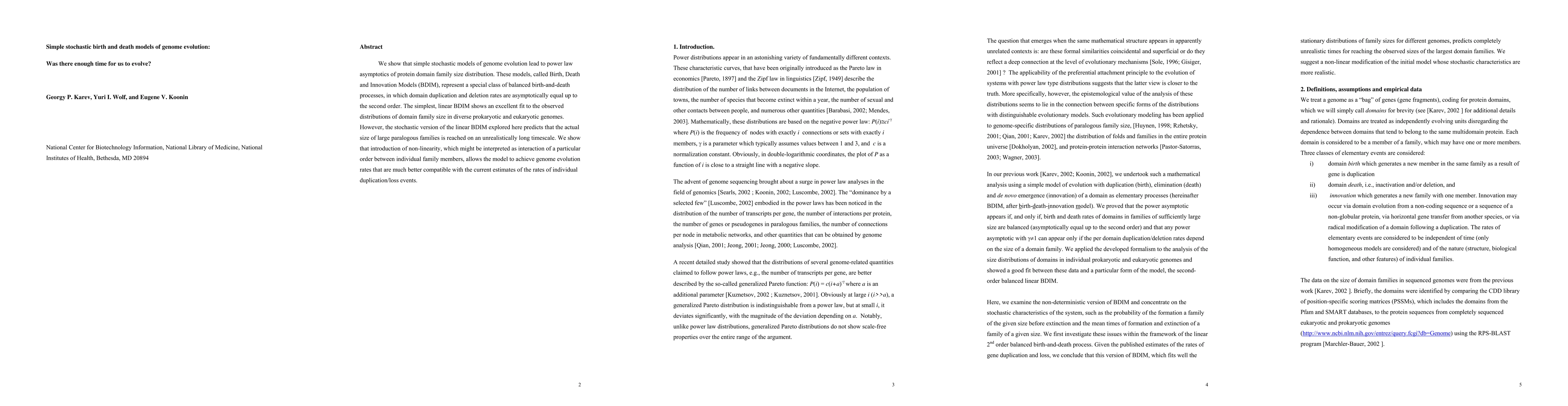 We show that simple stochastic models of genome evolution lead to power law asymptotics of protein domain family size distribution. These models, called Birth, Death and Innovation Models (BDIM), represent a special class of balanced birth-and-death processes, in which domain duplication and deletion rates are asymptotically equal up to the second order. The simplest, linear BDIM shows an excellent fit to the observed distributions of domain family size in diverse prokaryotic and eukaryotic genomes. However, the stochastic version of the linear BDIM explored here predicts that the actual size of large paralogous families is reached on an unrealistically long timescale. We show that introduction of non-linearity, which might be interpreted as interaction of a particular order between individual family members, allows the model to achieve genome evolution rates that are much better compatible with the current estimates of the rates of individual duplication/loss events.