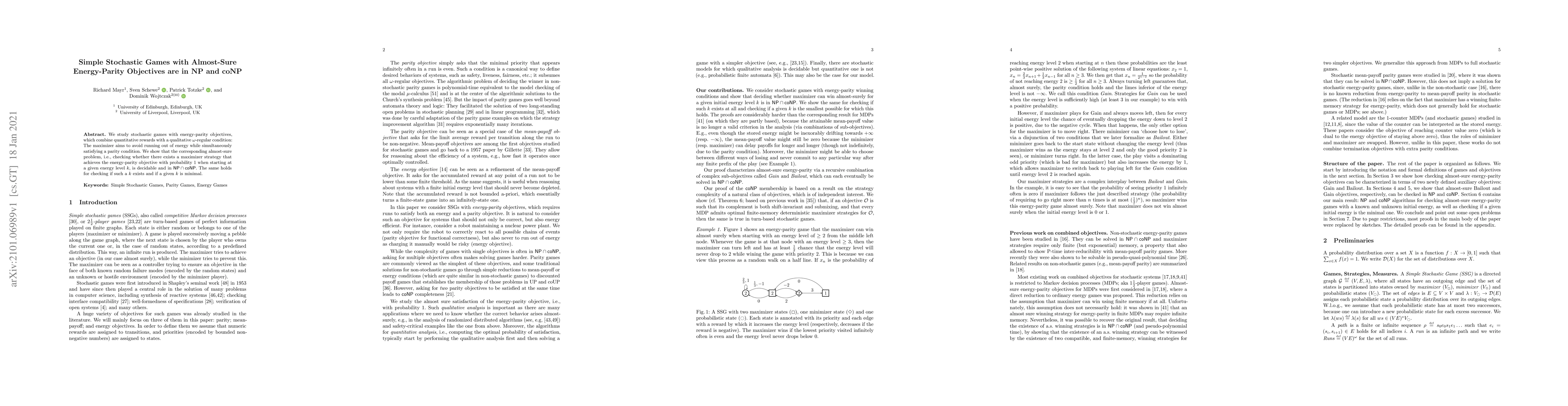 We study stochastic games with energy-parity objectives, which combine quantitative rewards with a qualitative $\omega$-regular condition: The maximizer aims to avoid running out of energy while simultaneously satisfying a parity condition. We show that the corresponding almost-sure problem, i.e., checking whether there exists a maximizer strategy that achieves the energy-parity objective with probability $1$ when starting at a given energy level $k$, is decidable and in $NP \cap coNP$. The same holds for checking if such a $k$ exists and if a given $k$ is minimal.