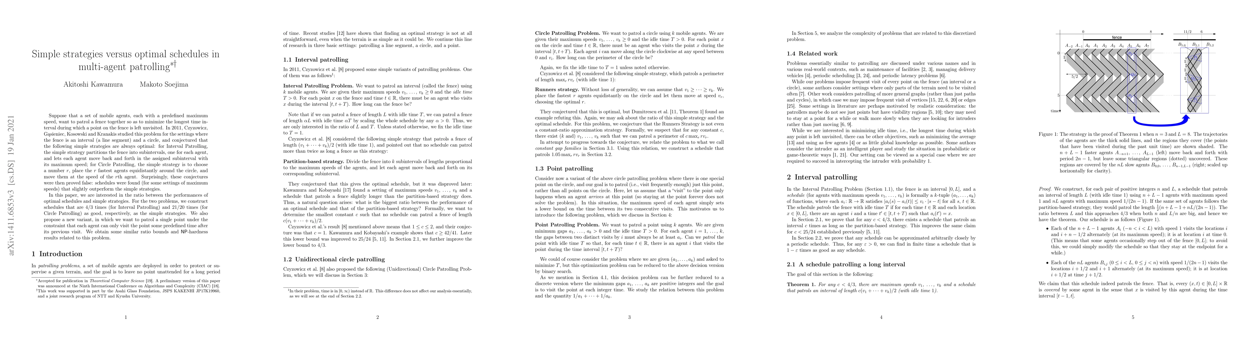 This paper investigates the efficiency of simple patrolling strategies compared to optimal schedules for multi-agent patrolling along a line segment and a circle. It finds that optimal schedules outperform simple strategies by ratios of 4/3 and 21/20 for the respective problems, and introduces a new variant with similar ratio bounds and NP-hardness results.