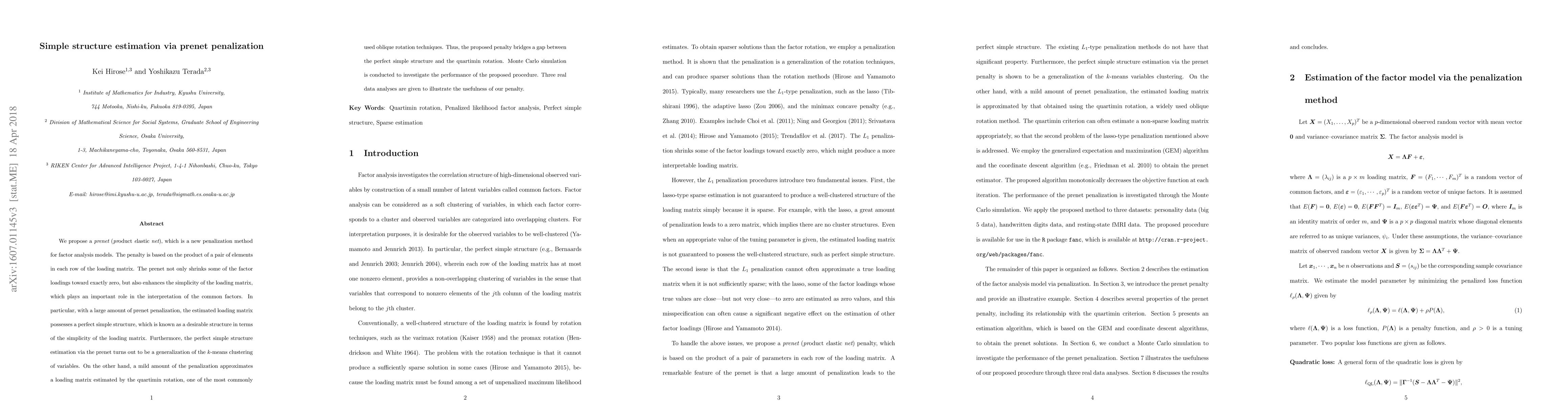 We propose a $prenet$ ($pr$oduct $e$lastic $net$), which is a new penalization method for factor analysis models. The penalty is based on the product of a pair of elements in each row of the loading matrix. The prenet not only shrinks some of the factor loadings toward exactly zero, but also enhances the simplicity of the loading matrix, which plays an important role in the interpretation of the common factors. In particular, with a large amount of prenet penalization, the estimated loading matrix possesses a perfect simple structure, which is known as a desirable structure in terms of the simplicity of the loading matrix. Furthermore, the perfect simple structure estimation via the prenet turns out to be a generalization of the $k$-means clustering of variables. On the other hand, a mild amount of the penalization approximates a loading matrix estimated by the quartimin rotation, one of the most commonly used oblique rotation techniques. Thus, the proposed penalty bridges a gap between the perfect simple structure and the quartimin rotation. Monte Carlo simulation is conducted to investigate the performance of the proposed procedure. Three real data analyses are given to illustrate the usefulness of our penalty.