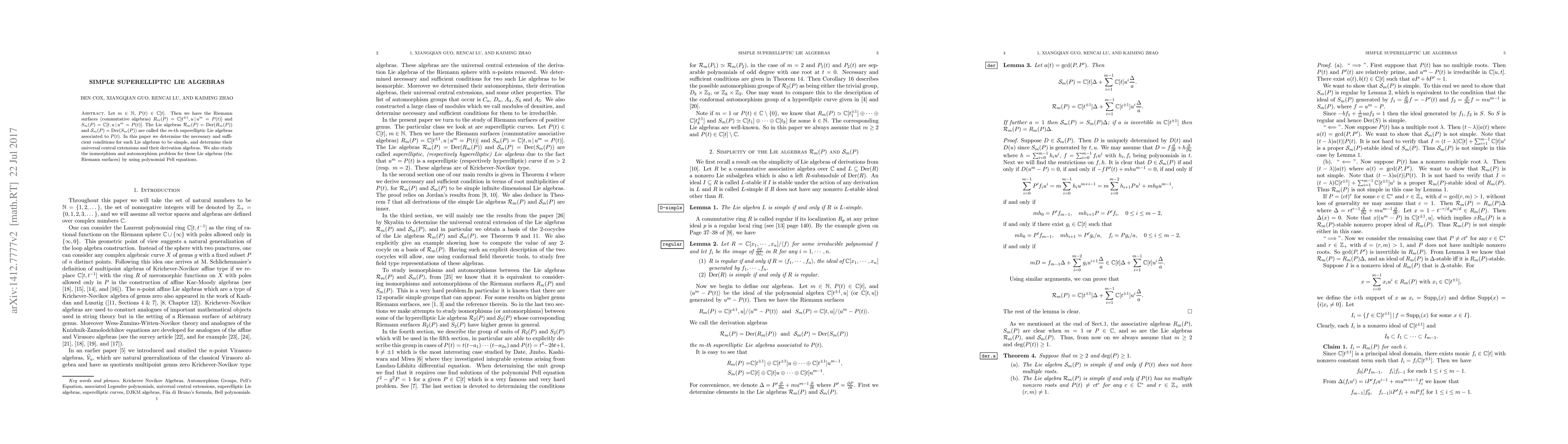 Let $m\in N$, $P(t)\in C[t]$. Then we have the Riemann surfaces (commutative algebras) $R_m(P)=C[t^{\pm1},u | u^m=P(t)]$ and $S_m(P)=C[t , u| u^m=P(t)].$ The Lie algebras $\mathcal{R}_m(P)=Der(R_m(P))$ and $\mathcal{S}_m(P)=Der(S_m(P))$ are called the $m$-th superelliptic Lie algebras associated to $P(t)$. In this paper we determine the necessary and sufficient conditions for such Lie algebras to be simple, and determine their universal central extensions and their derivation algebras. We also study the isomorphism and automorphism problem for these Lie algebras.