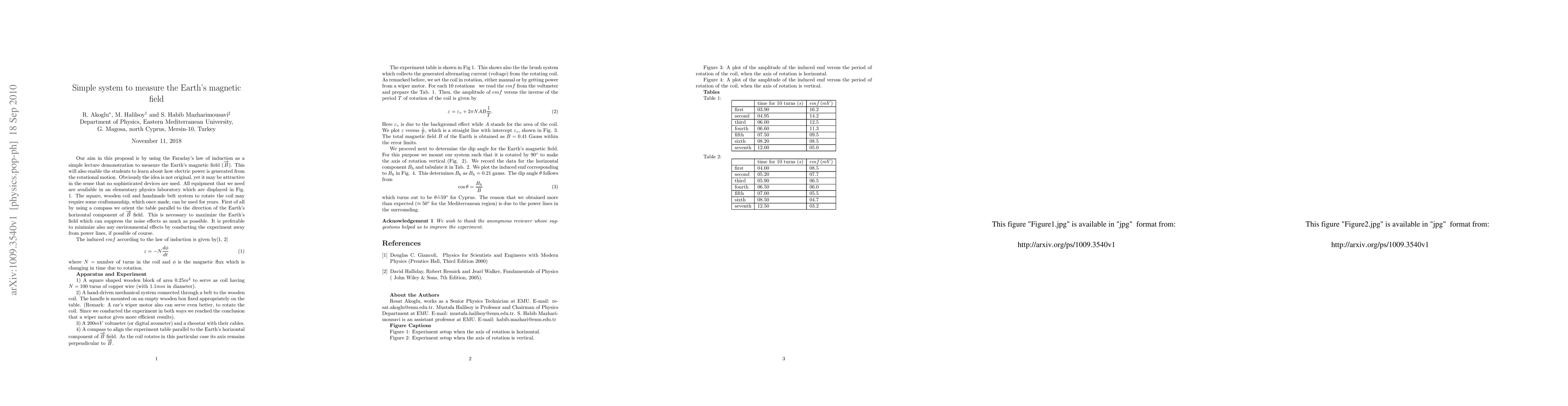 Our aim in this proposal is by using the Faraday's law of induction as a simple lecture demonstration to measure the Earth's magnetic field (B). This will also enable the students to learn about how electric power is generated from the rotational motion. Obviously the idea is not original, yet it may be attractive in the sense that no sophisticated devices are used.