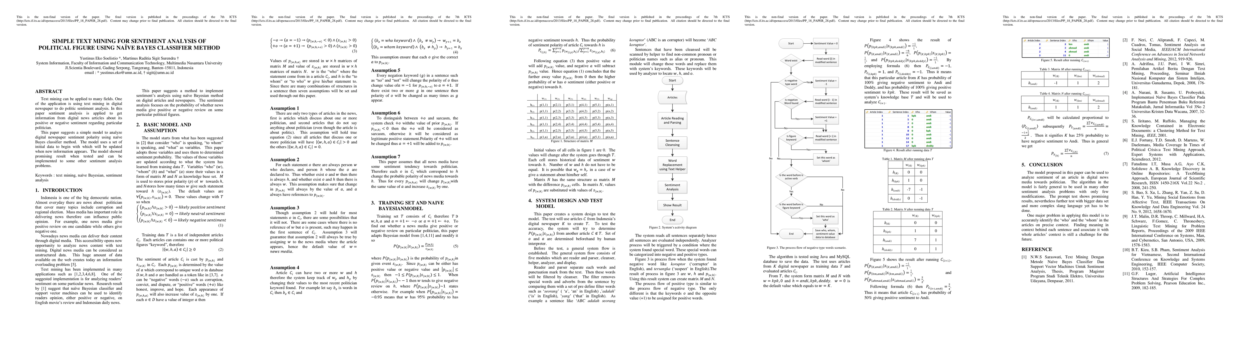 This paper proposes a simple text mining model using the naive Bayes classifier to analyze sentiment polarity in digital newspaper articles about political figures. The model, which updates with new data, demonstrated promising results in sentiment analysis and has potential for broader applications.