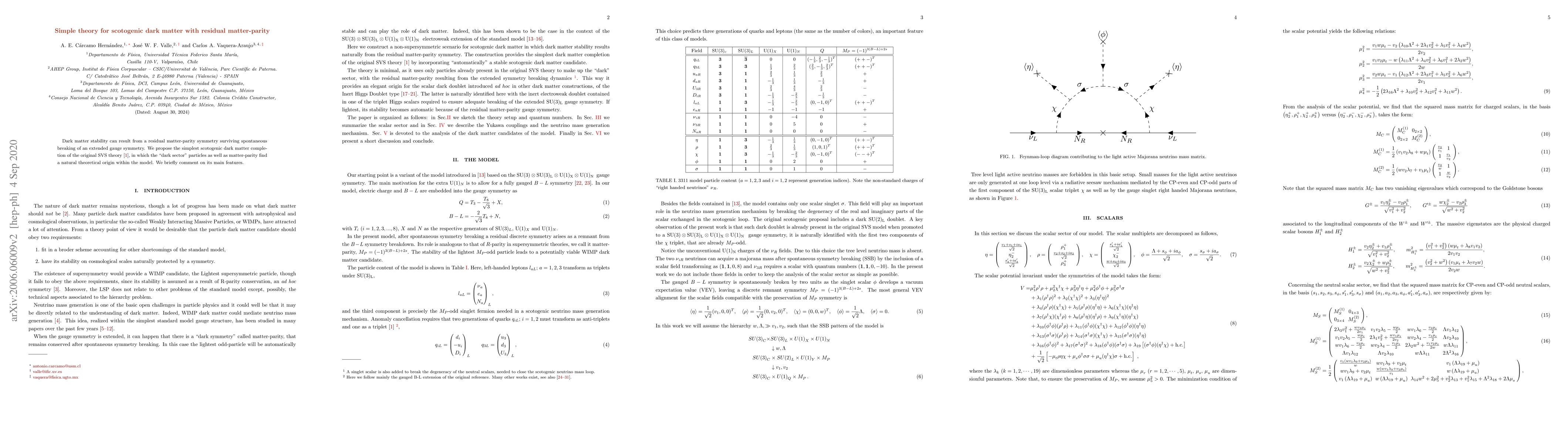 This paper proposes a simple scotogenic dark matter model where stability arises from a residual matter-parity symmetry after spontaneous symmetry breaking, extending the original SVS theory and providing a natural origin for both dark sector particles and matter-parity.