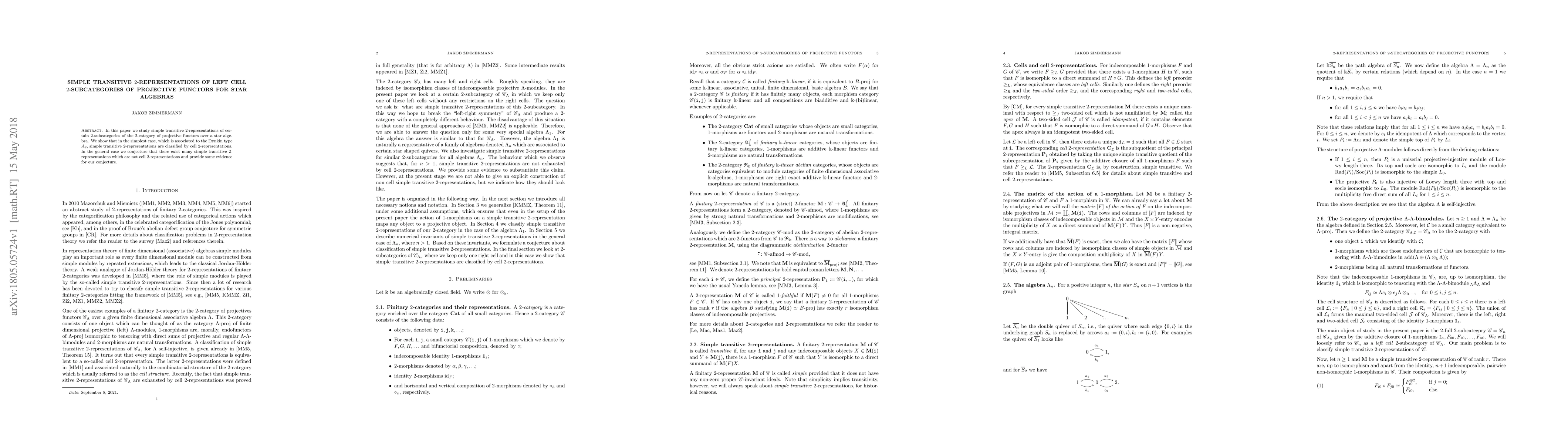 This paper studies simple transitive 2-representations of projective functors over star algebras, finding they're classified by cell 2-representations in the simplest case and conjecturing their existence in general cases.