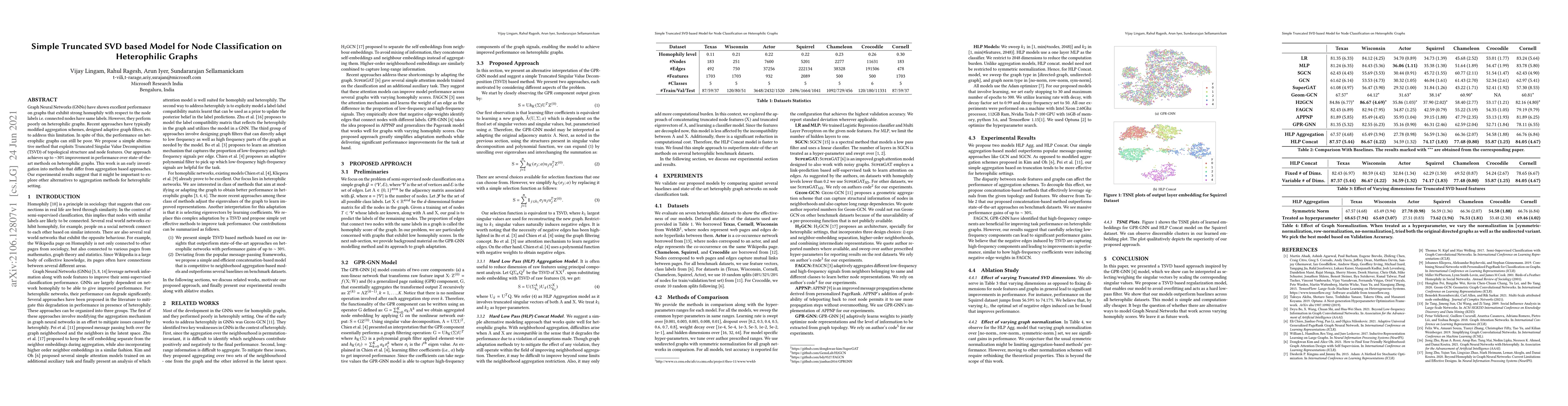 This paper proposes a Truncated Singular Value Decomposition (TSVD) based model for node classification on heterophilic graphs, which shows up to 30% improvement over state-of-the-art methods. The approach differs from traditional aggregation-based GNN methods, suggesting the potential value of alternative techniques for heterophilic graph classification.