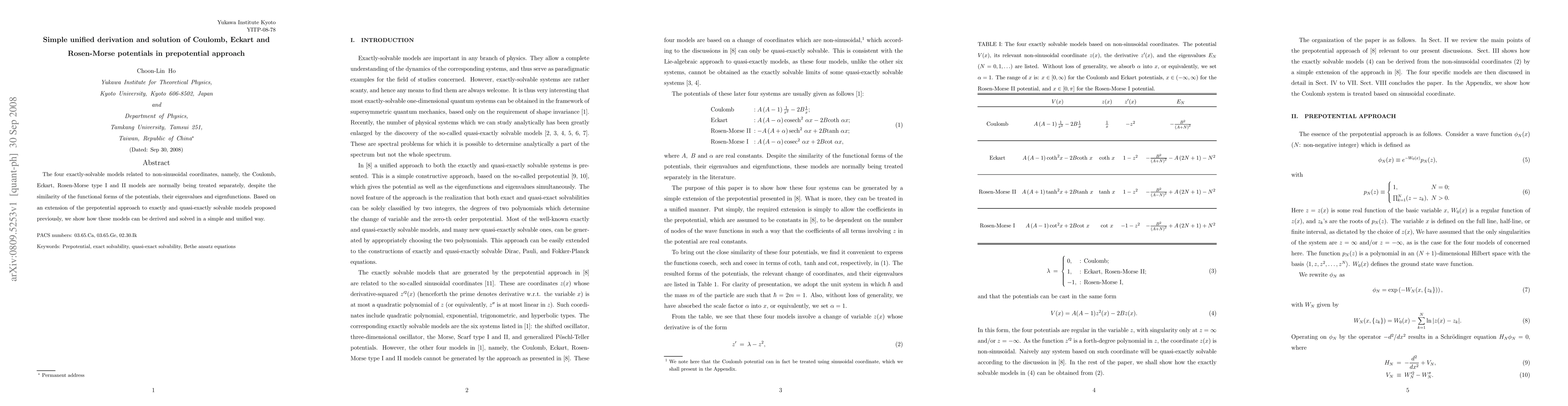 This paper presents a unified derivation and solution for the Coulomb, Eckart, and Rosen-Morse potentials using an extended prepotential approach, simplifying the treatment of these models despite their distinct functional forms. The method provides a straightforward solution for their eigenvalues and eigenfunctions.