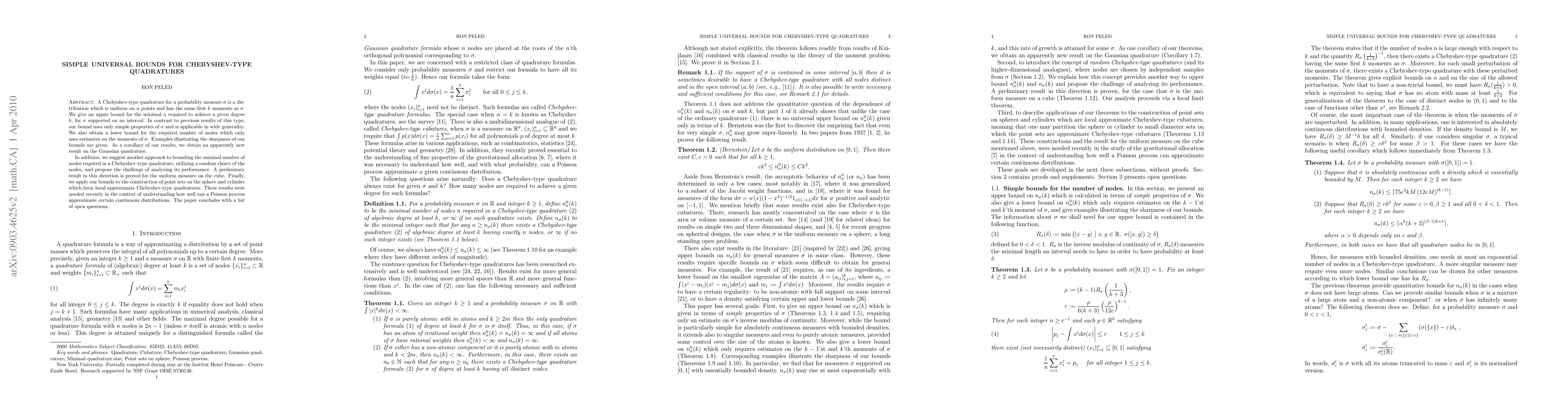This paper presents universal bounds for Chebyshev-type quadratures, providing simple upper and lower bounds for the minimal number of nodes required to match the first k moments of a given probability measure. It also introduces a new approach for bounding nodes using random selection and applies these results to construct approximate quadratures on the sphere and cylinder.