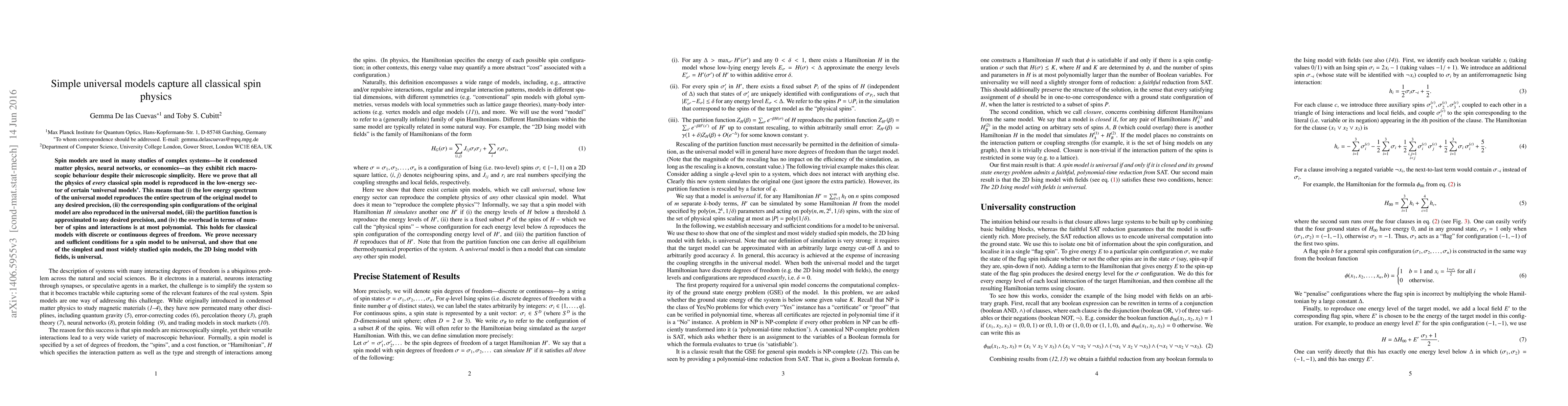 Spin models are used in many studies of complex systems---be it condensed matter physics, neural networks, or economics---as they exhibit rich macroscopic behaviour despite their microscopic simplicity. Here we prove that all the physics of every classical spin model is reproduced in the low-energy sector of certain `universal models'. This means that (i) the low energy spectrum of the universal model reproduces the entire spectrum of the original model to any desired precision, (ii) the corresponding spin configurations of the original model are also reproduced in the universal model, (iii) the partition function is approximated to any desired precision, and (iv) the overhead in terms of number of spins and interactions is at most polynomial. This holds for classical models with discrete or continuous degrees of freedom. We prove necessary and sufficient conditions for a spin model to be universal, and show that one of the simplest and most widely studied spin models, the 2D Ising model with fields, is universal.