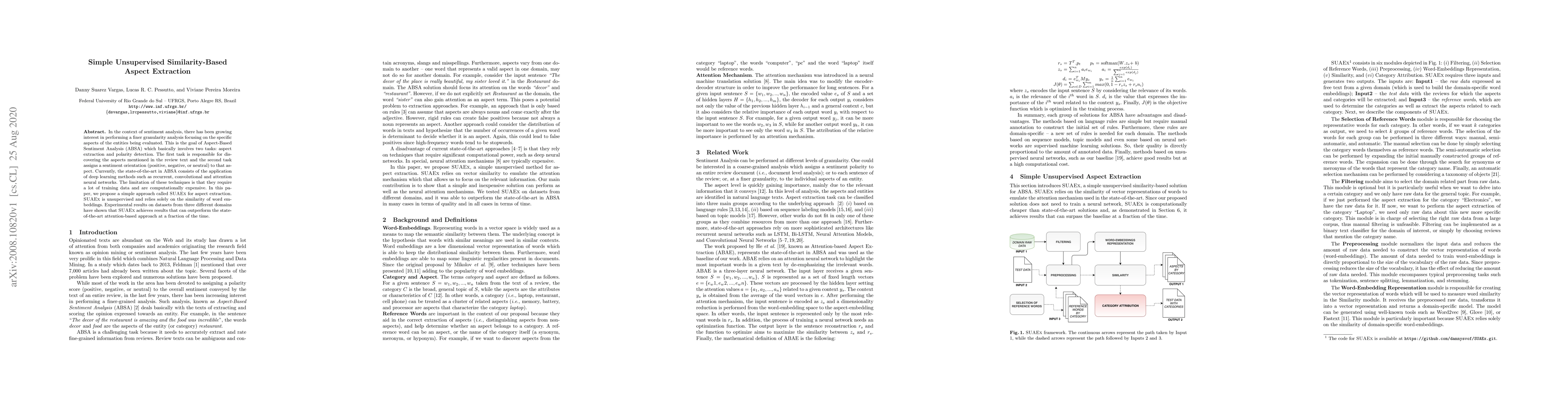 This paper introduces SUAEx, a simple unsupervised method for aspect extraction in Aspect-Based Sentiment Analysis (ABSA) that leverages word embedding similarity without requiring training data. The proposed approach outperforms state-of-the-art attention-based methods in terms of computational efficiency.