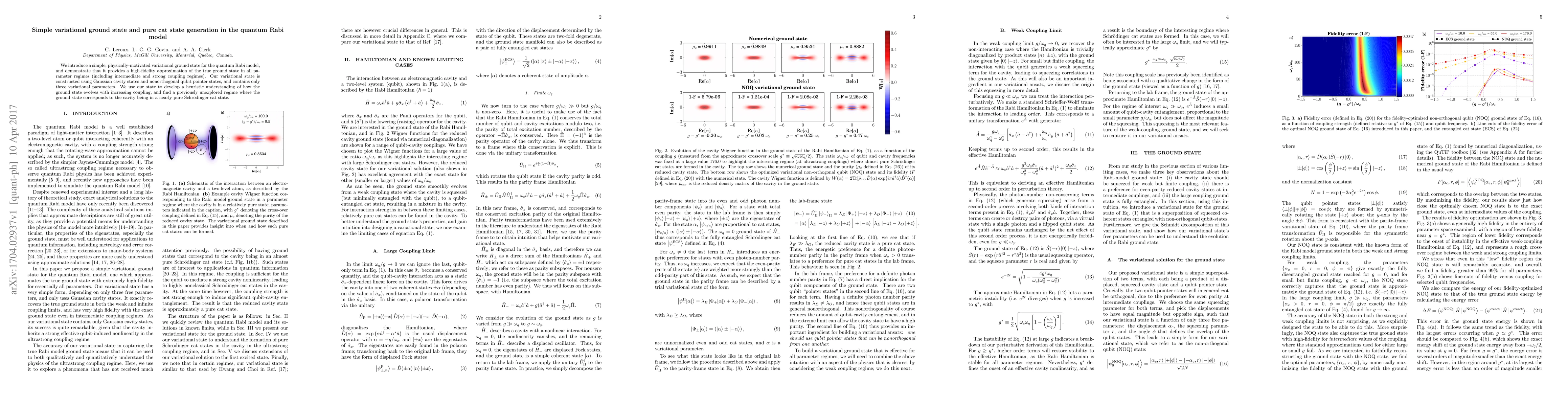This paper presents a simple variational ground state for the quantum Rabi model that accurately approximates the true ground state across all parameter regimes. It also uncovers a new regime where the ground state resembles a nearly pure Schrödinger cat state in the cavity.