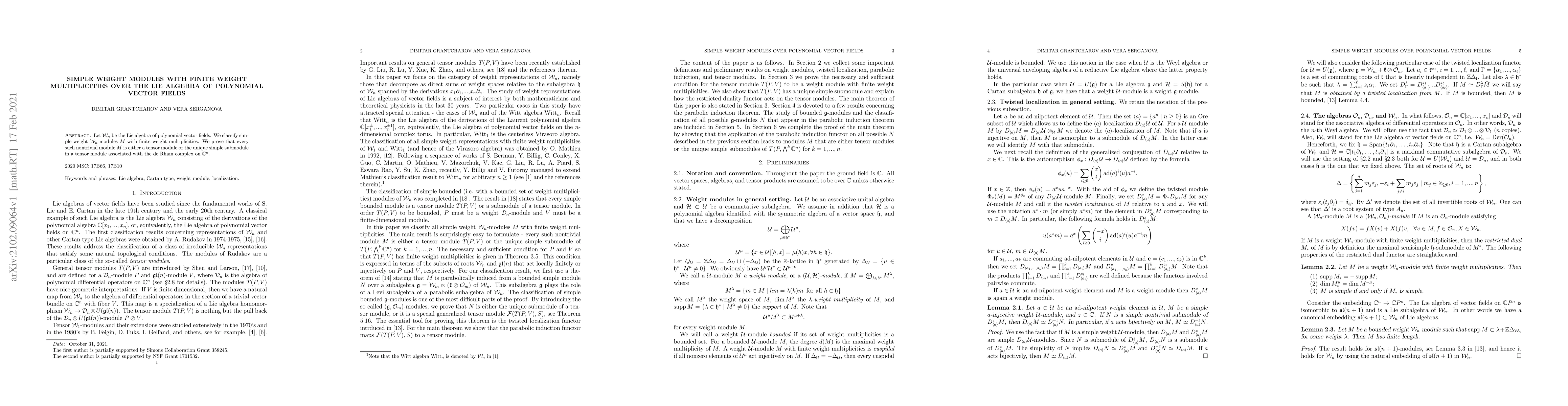 Let ${\mathcal W}_n$ be the Lie algebra of polynomial vector fields. We classify simple weight ${\mathcal W}_n$-modules $M$ with finite weight multiplicities. We prove that every such nontrivial module $M$ is either a tensor module or the unique simple submodule in a tensor module associated with the de Rham complex on $\mathbb C^n$.