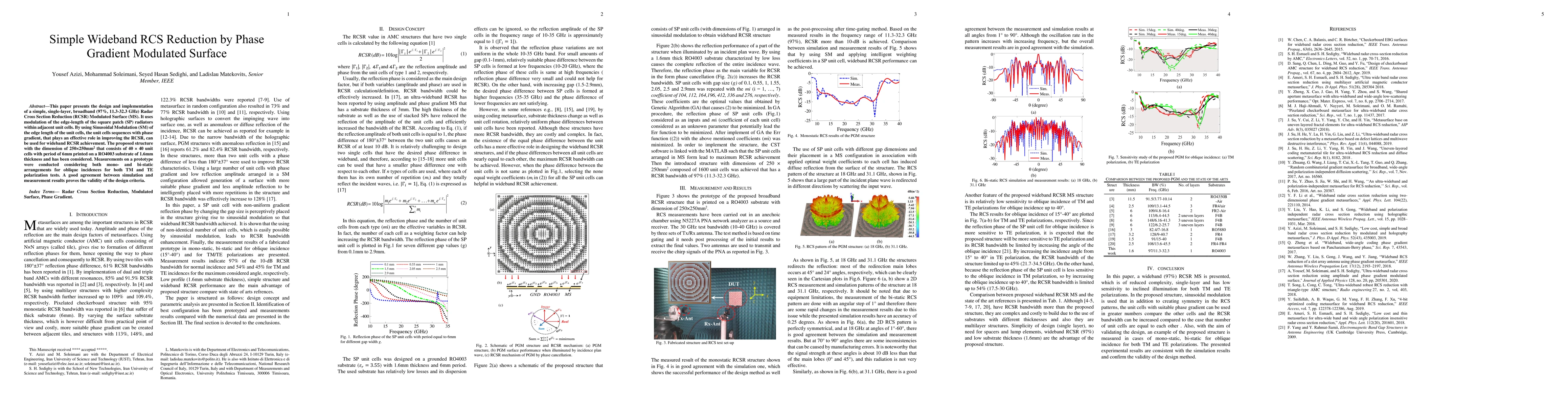 This paper presents the design and implementation of a simple, single-layer, broadband (97%, 11.3-32.3 GHz) Radar Cross Section Reduction (RCSR) Modulated Surface (MS). It uses modulation of the edge-length of the square patch (SP) radiators within adjacent unit cells. By using Sinusoidal Modulation (SM) of the edge length of the unit cells, the unit cells sequences with phase gradient, that plays an effective role in improving the RCSR, can be used for wideband RCSR achievement. The proposed structure with the dimension of 250*250mm2 that consists of 40 * 40 unit cells with period of 6mm printed on a RO4003 substrate of 1.6mm thickness and has been considered. Measurements on a prototype were conducted considering both mono- and bi-static arrangements for oblique incidences for both TM and TE polarization tests. A good agreement between simulation and measurement results proves the validity of the design criteria.