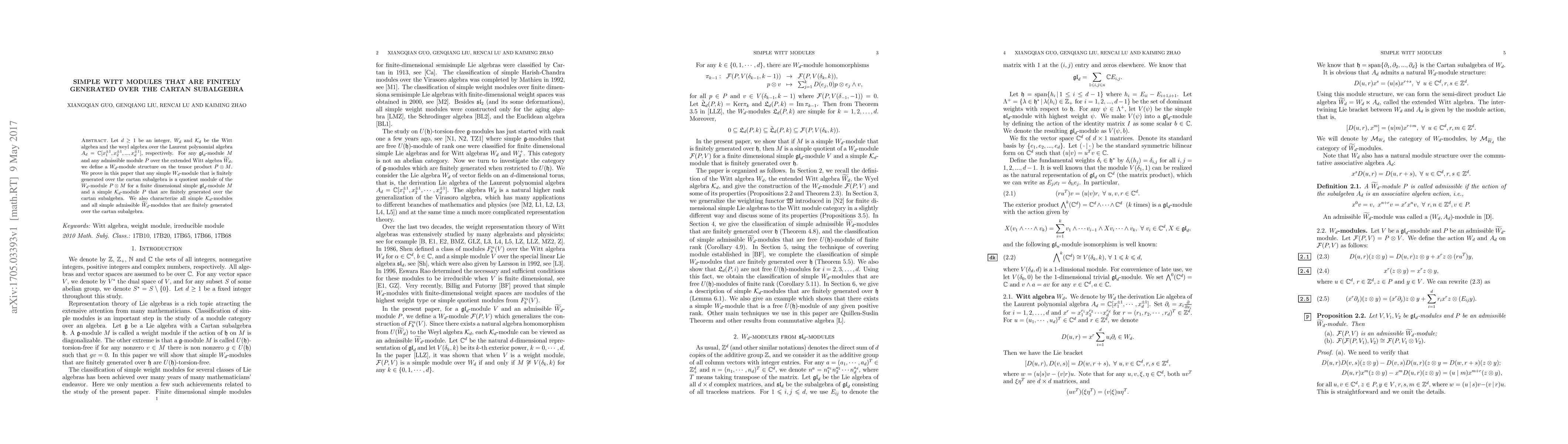 Let $d\ge1$ be an integer, $W_d$ and $\mathcal{K}_d$ be the Witt algebra and the weyl algebra over the Laurent polynomial algebra $A_d=\mathbb{C} [x_1^{\pm1}, x_2^{\pm1}, ..., x_d^{\pm1}]$, respectively. For any $\mathfrak{gl}_d$-module $M$ and any admissible module $P$ over the extended Witt algebra $\widetilde W_d$, we define a $W_d$-module structure on the tensor product $P\otimes M$. We prove in this paper that any simple $W_d$-module that is finitely generated over the cartan subalgebra is a quotient module of the $W_d$-module $P \otimes M$ for a finite dimensional simple $\mathfrak{gl}_d$-module $M$ and a simple $\mathcal{K}_d$-module $P$ that are finitely generated over the cartan subalgebra. We also characterize all simple $\mathcal{K}_d$-modules and all simple admissible $\widetilde W_d$-modules that are finitely generated over the cartan subalgebra.