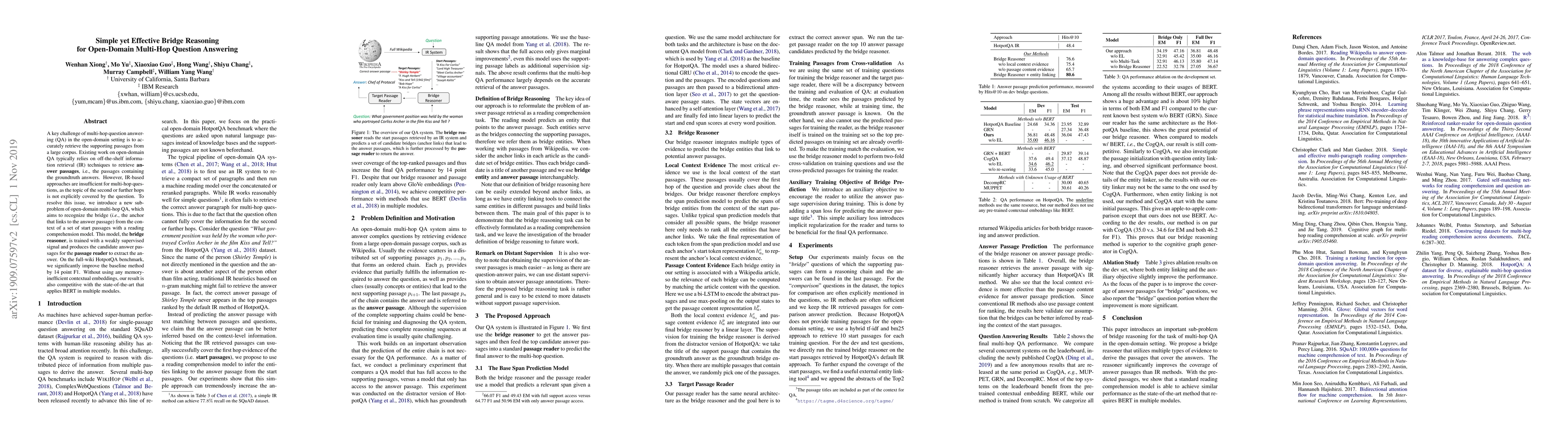 This paper introduces a new approach to open-domain multi-hop question answering by developing a bridge reasoner to identify key passages linking to the final answer, significantly improving performance on the HotpotQA benchmark. The method outperforms baselines and is competitive with state-of-the-art models without using memory-intensive contextual embeddings.
