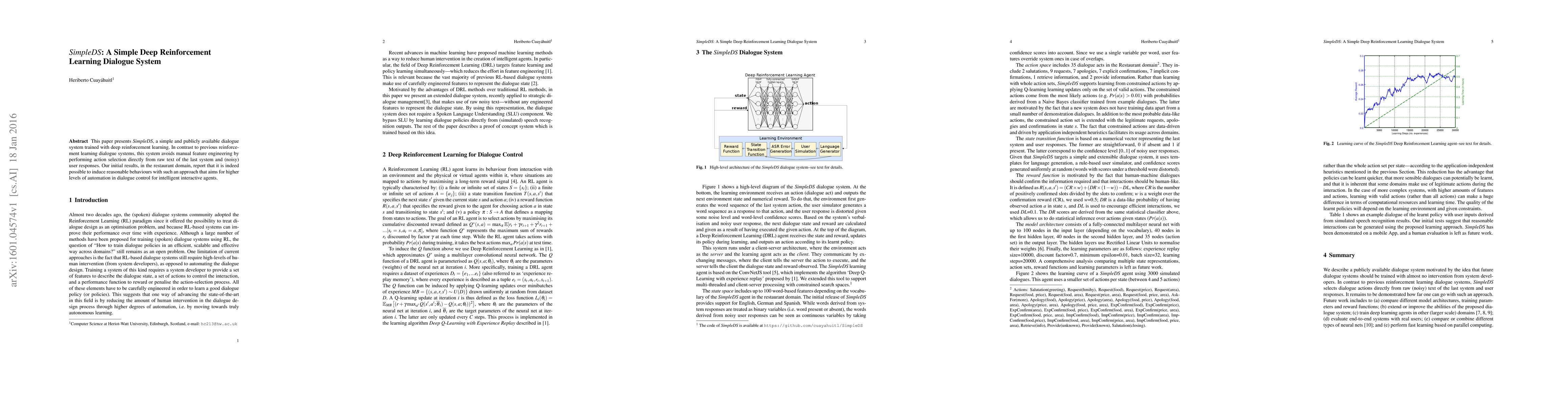 SimpleDS is a deep reinforcement learning-based dialogue system that automates dialogue control by selecting actions directly from raw text inputs, avoiding manual feature engineering. Initial results in the restaurant domain demonstrate its potential for inducing reasonable dialogue behavior with minimal human intervention.